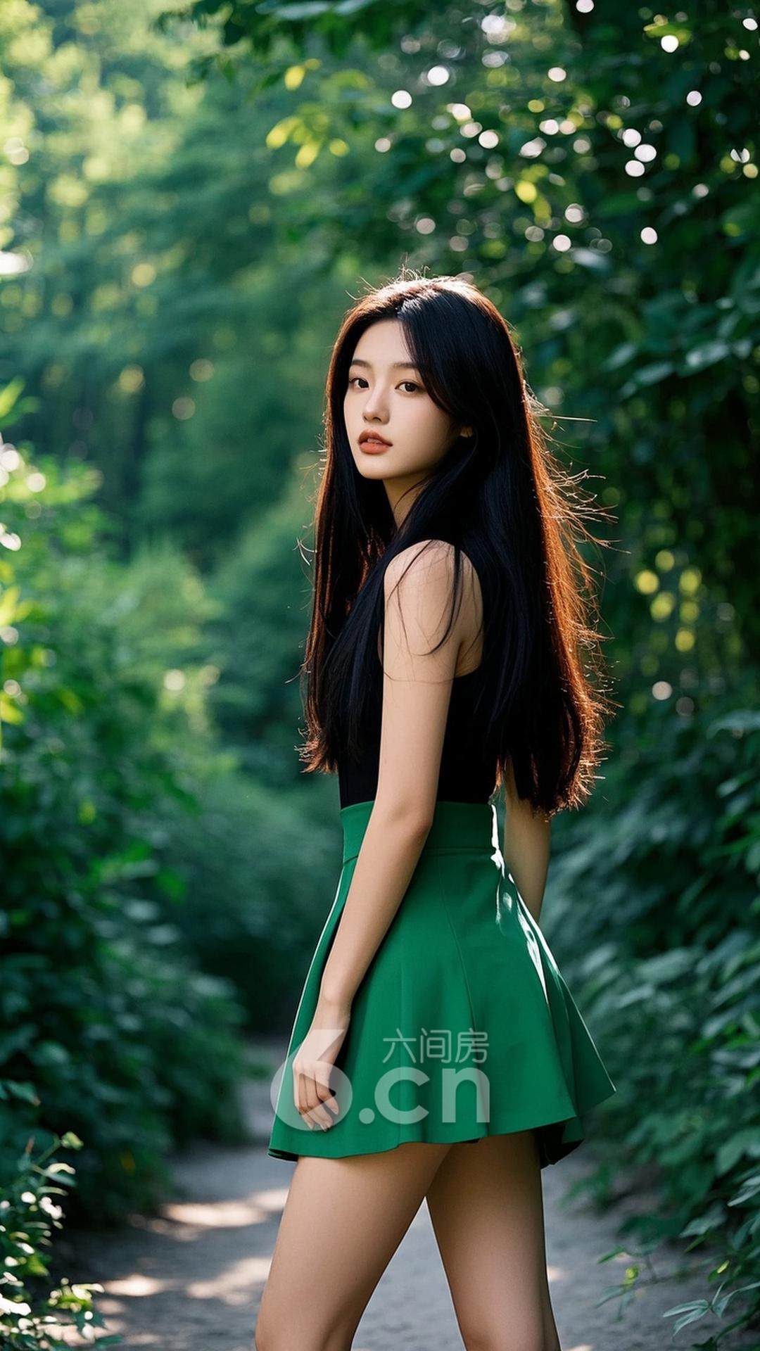 一位年轻的中国女性,穿着绿色短裙,长发披肩,站在阳光洒下的山林小道上,背景是悠扬的风声与古树参天,展现她的优雅与大自然气息