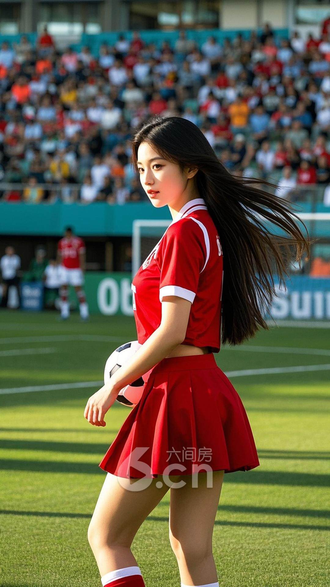 一位年轻的中国女性,穿着红色短裙,搭配足球队的球衣,长发随风飘动,站在阳光下的球场上,背景是正在比赛的足球队与观众,展现她的活力与青春