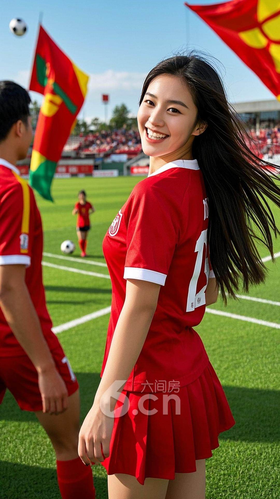 一位年轻的中国女性,穿着红色短裙,搭配足球队的球衣,长发随风飘动,站在阳光明媚的球场旁,背景是欢呼的球迷与激烈的比赛,展现她的活力与运动魅力