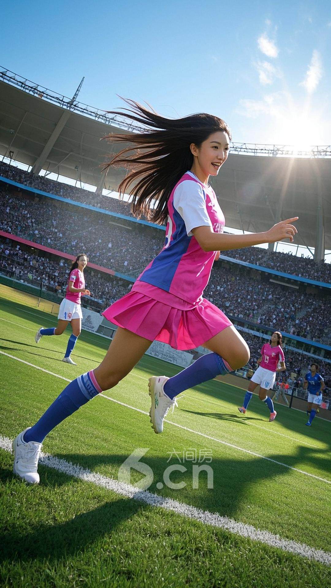 一位年轻的中国女性,穿着粉色短裙,搭配球队球衣,长发飘动,站在阳光下的绿茵场,背景是热烈的比赛氛围与兴奋的观众,展现她的自信与运动魅力