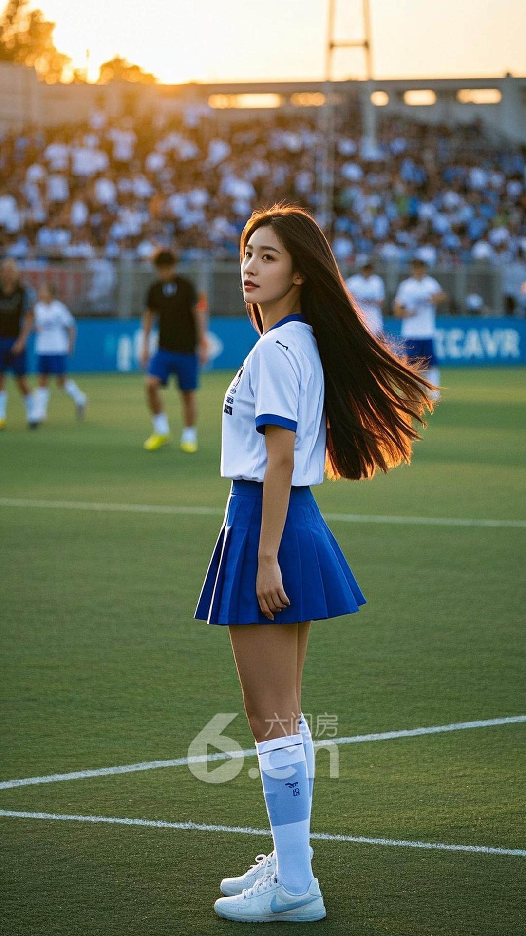一位年轻的中国女性,穿着蓝色短裙,搭配白色球衣,长发随风飘动,站在阳光明媚的球场旁,背景是热烈的比赛气氛与观众的欢呼,展现她的时尚与运动魅力