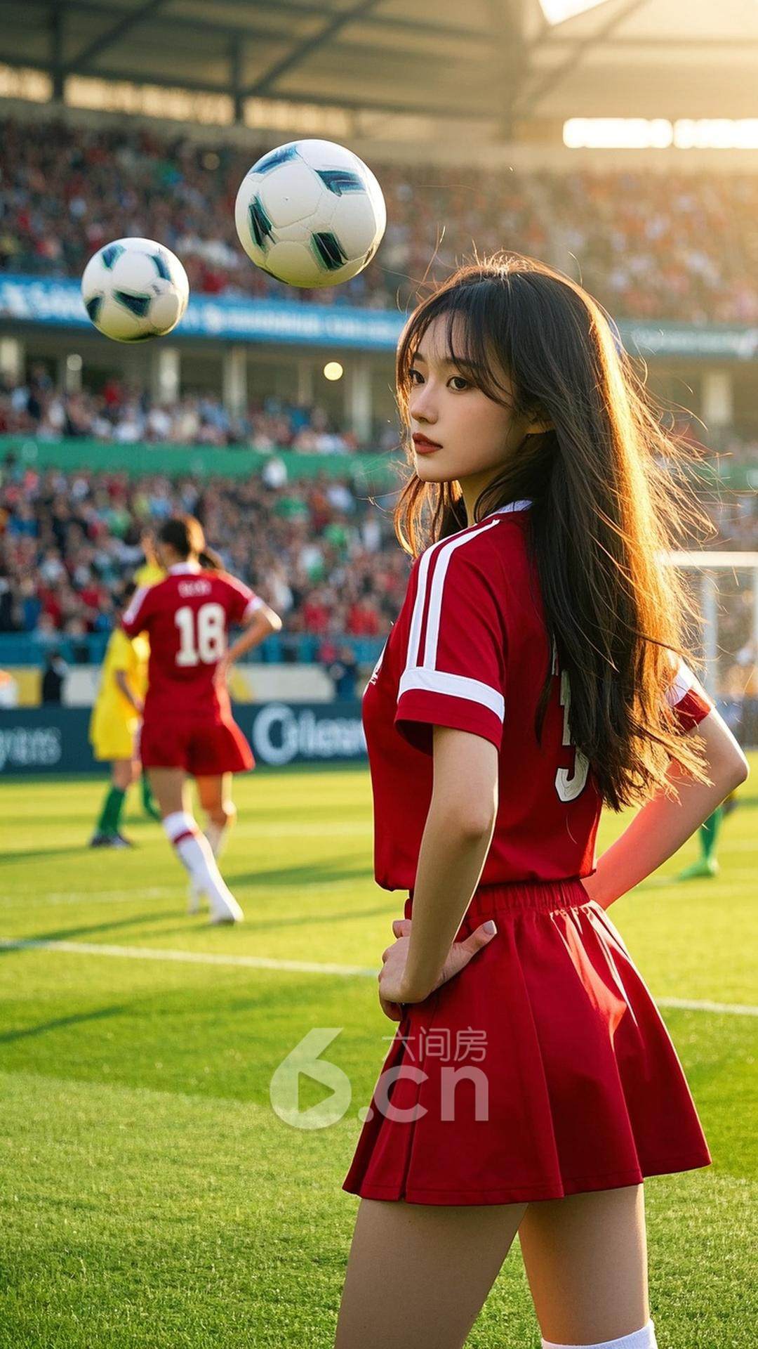 一位女性,穿着红色短裙,搭配球队球衣,长发自然披肩,站在阳光照射下的草坪上,背景是激烈的比赛与飞扬的足球,展现她的青春与动感气质