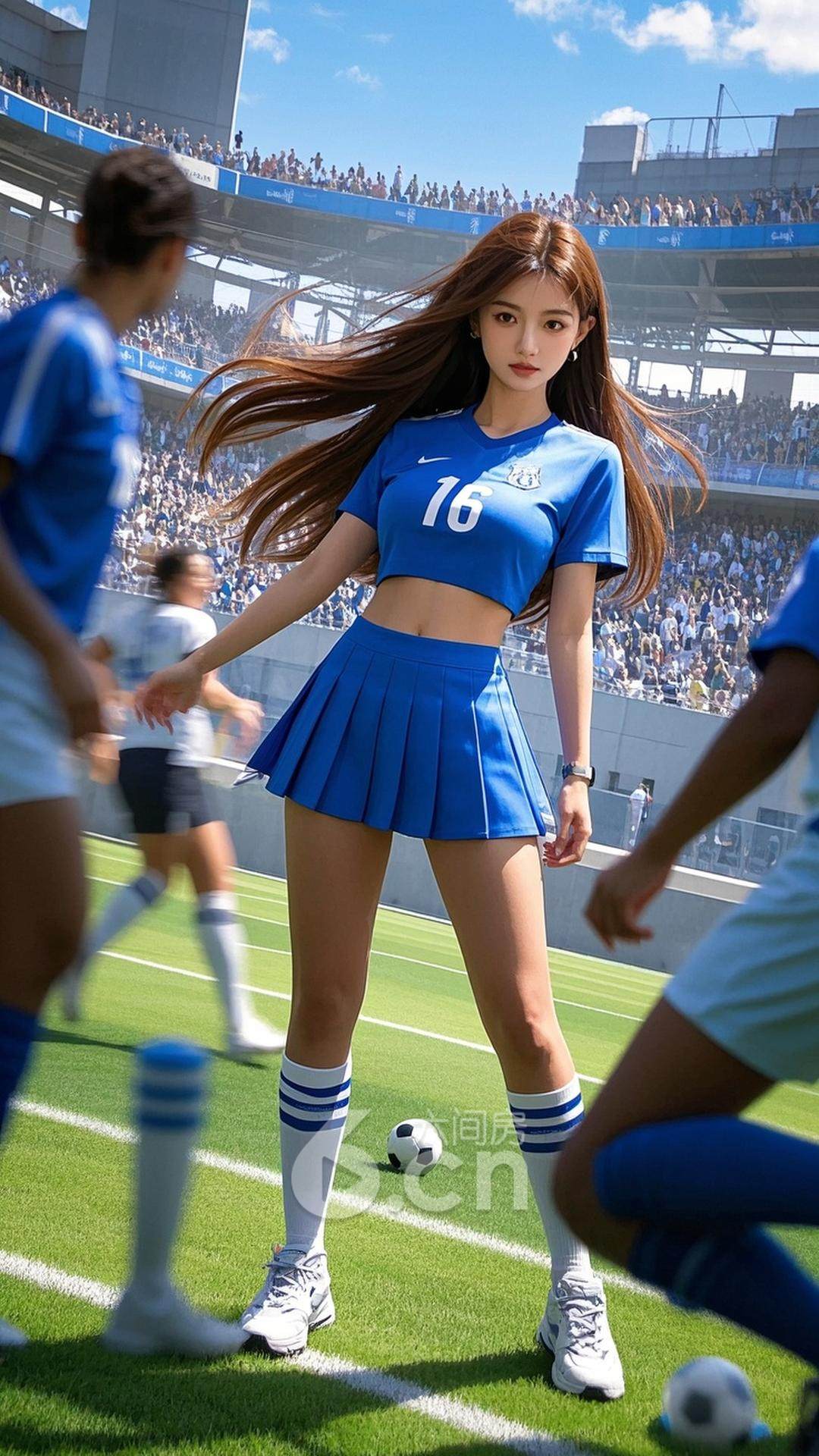 一位女性,穿着蓝色短裙,长发随风飘动,站在阳光洒满的足球场上,背景是快速奔跑的球员与欢呼的观众,展现她的自信与青春气息