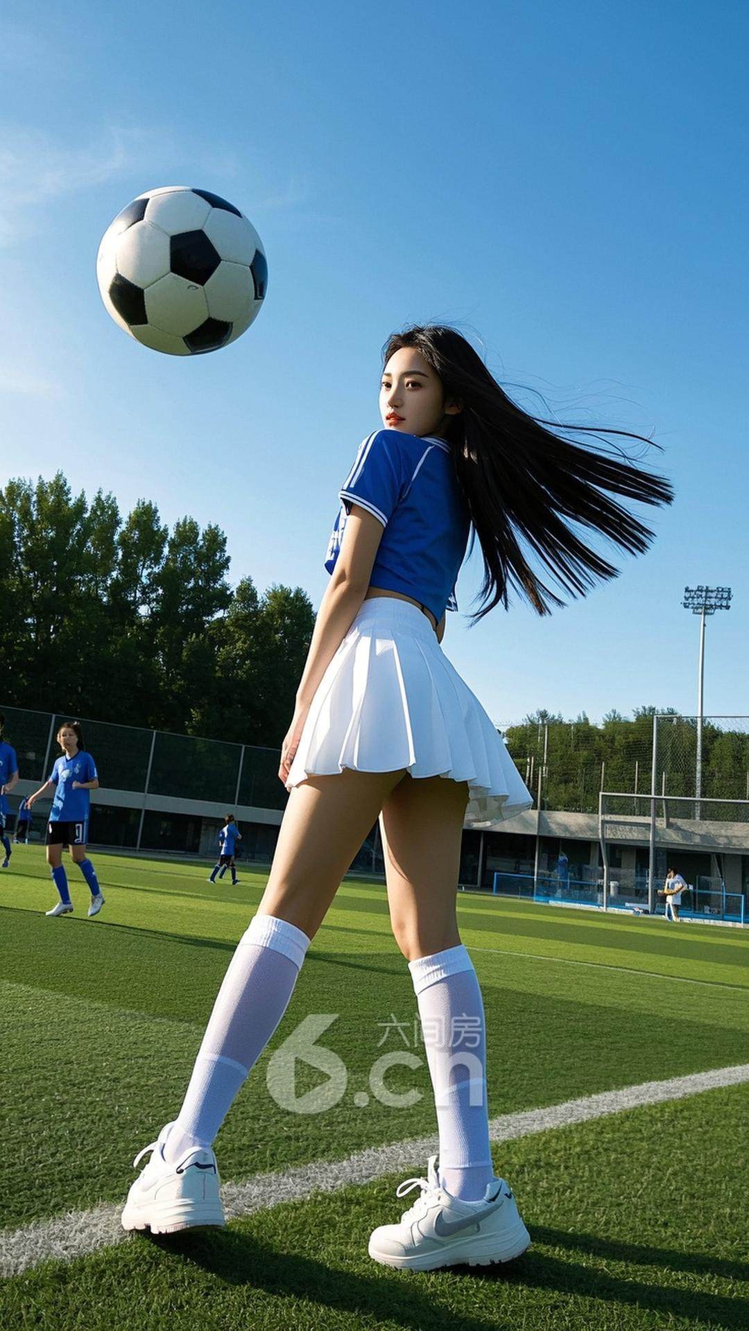 一位年轻的中国女性,穿着白色短裙,搭配球队球衣,长发披肩,站在阳光照射下的草坪上,背景是足球场上的比赛与飞舞的足球,展现她的自信与青春气息