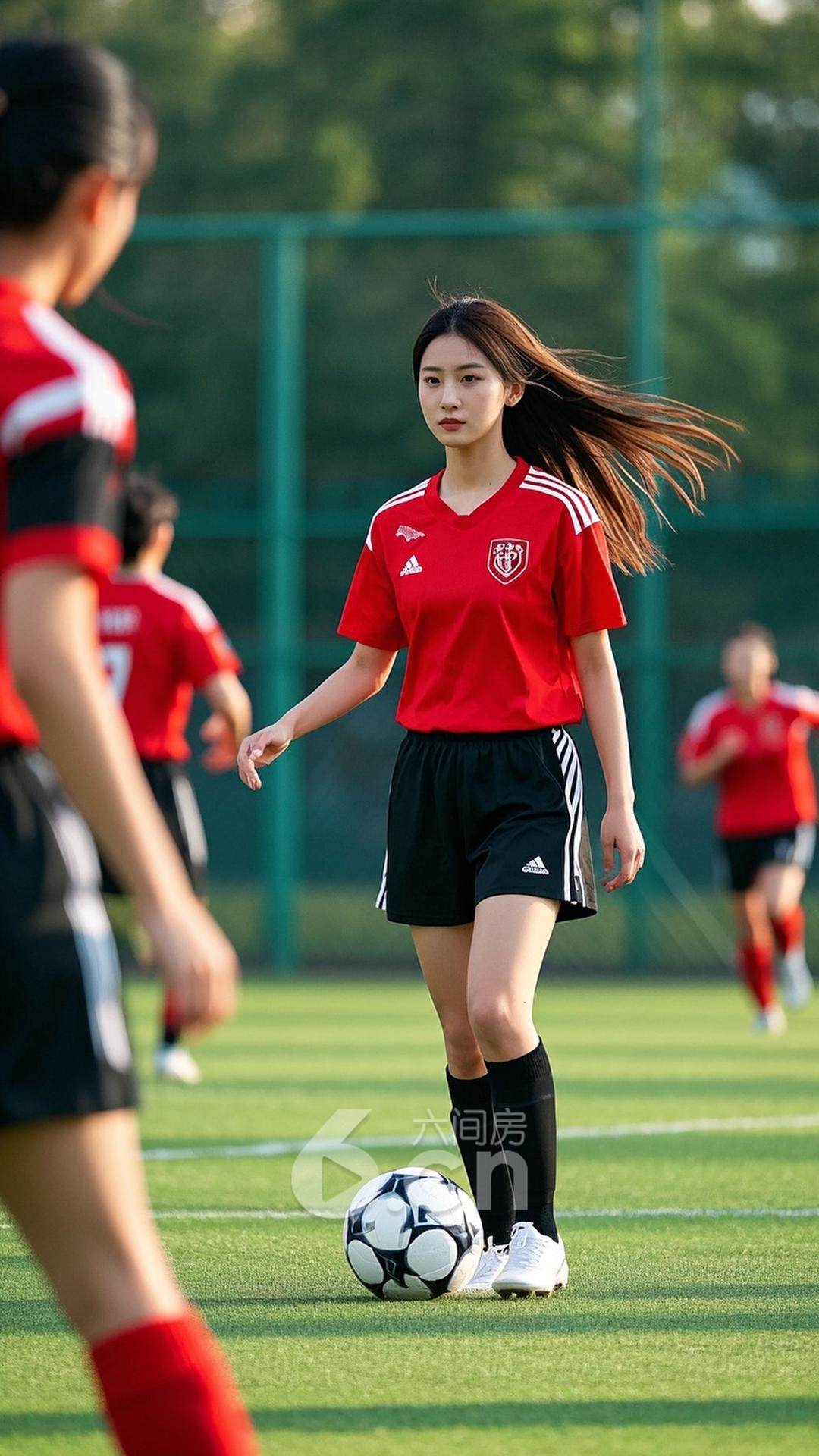 一位年轻的中国女性,穿着黑色短裙,搭配红色球衣,长发随风飘动,站在阳光洒满的绿茵场上,背景是奔跑的球员与激烈的对抗,展现她的青春与足球魅力