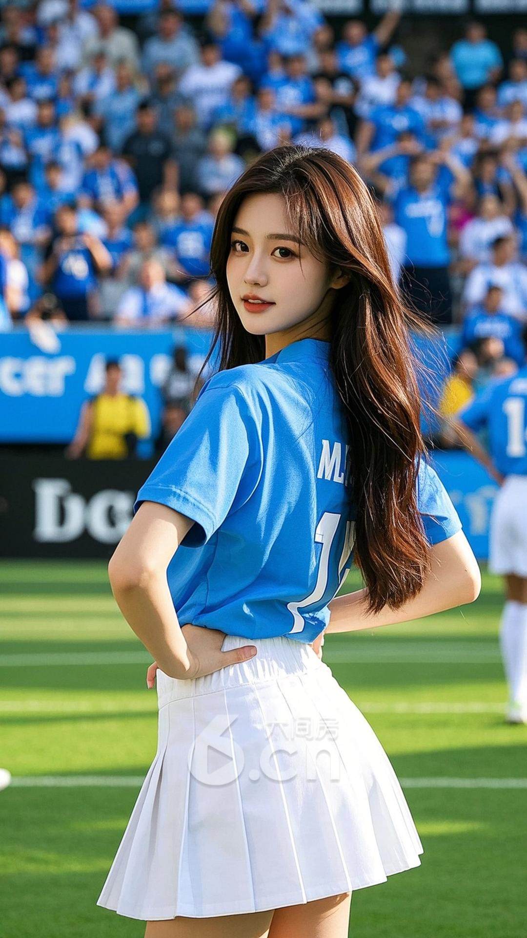 一位女性,穿着白色短裙,搭配球队球衣,长发披肩,站在阳光照射下的球场上,背景是热烈的比赛和充满活力的球迷,展现她的青春与自信