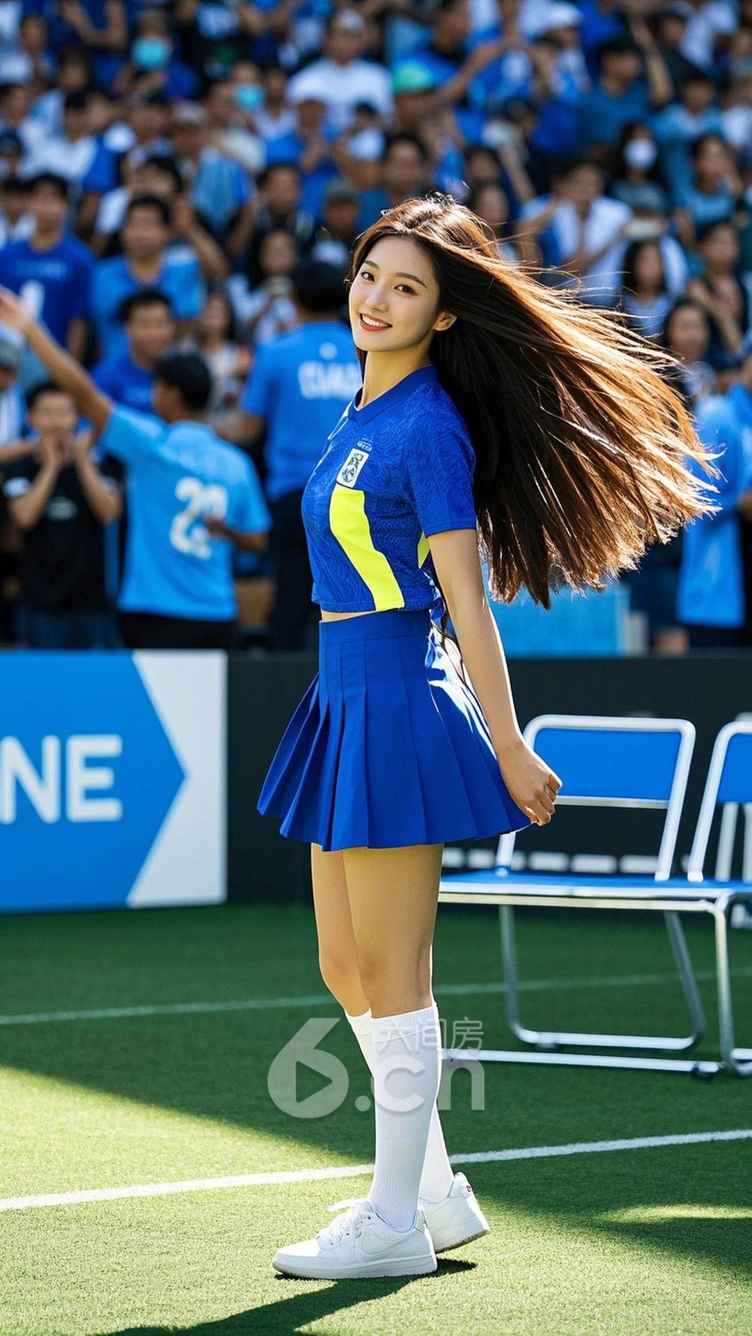 一位年轻的中国女性,穿着蓝色短裙,长发随风飘动,站在阳光明媚的球场上,背景是激烈的比赛与欢呼的球迷,展现她的活力与青春气息