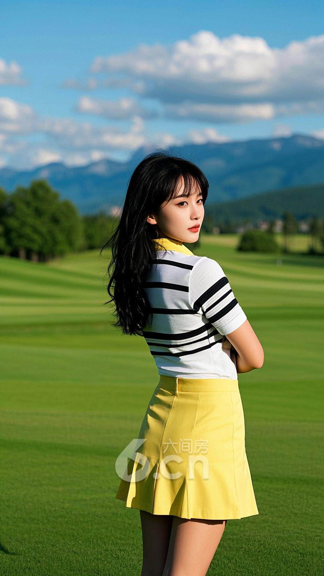 一位女性,穿着黄色短裙,搭配高尔夫球衣,长发披肩,站在阳光下的高尔夫球场,背景是宽广的草坪与远处的球洞,展现她的优雅与魅力