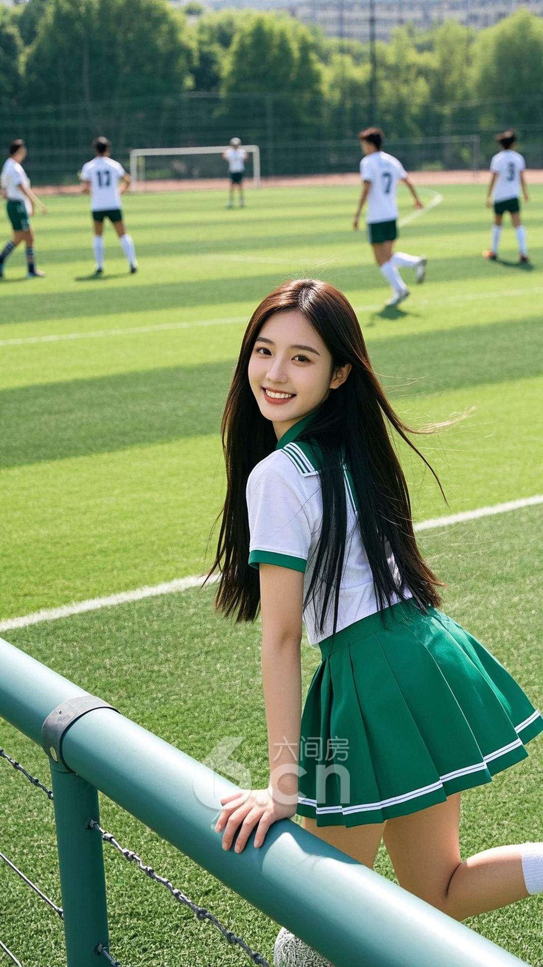 一位年轻的中国女性,穿着绿色短裙,长发随风飘动,站在阳光照射下的球场边,背景是清新的草坪与球员们的精彩表现,展现她的青春与运动魅力