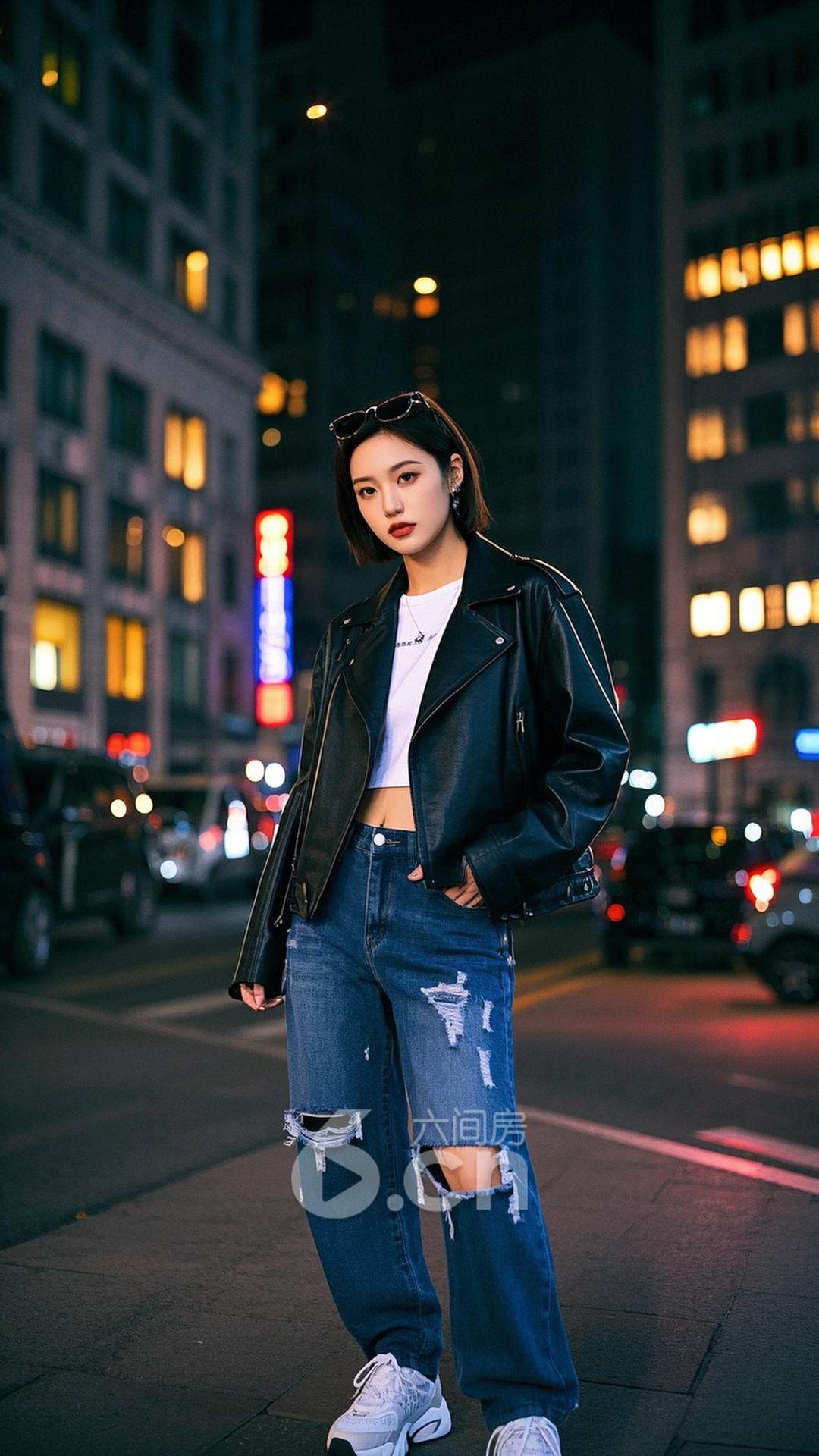 一位女性,穿着黑色机车皮夹克,搭配破洞牛仔裤与运动鞋,短发,站在夜晚的城市街头,背景是闪亮的霓虹灯与科技感十足的建筑,展现她的酷感与都市魅力