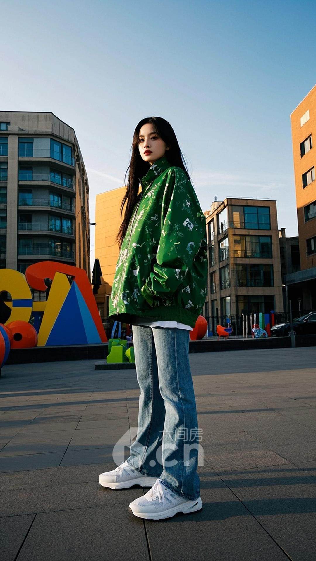 一位女性,穿着绿色印花夹克,搭配白色运动鞋,长发自然垂落,站在充满现代艺术的城市广场,背景是富有创意的建筑与色彩斑斓的街头装饰,展现她的个性与前卫气质