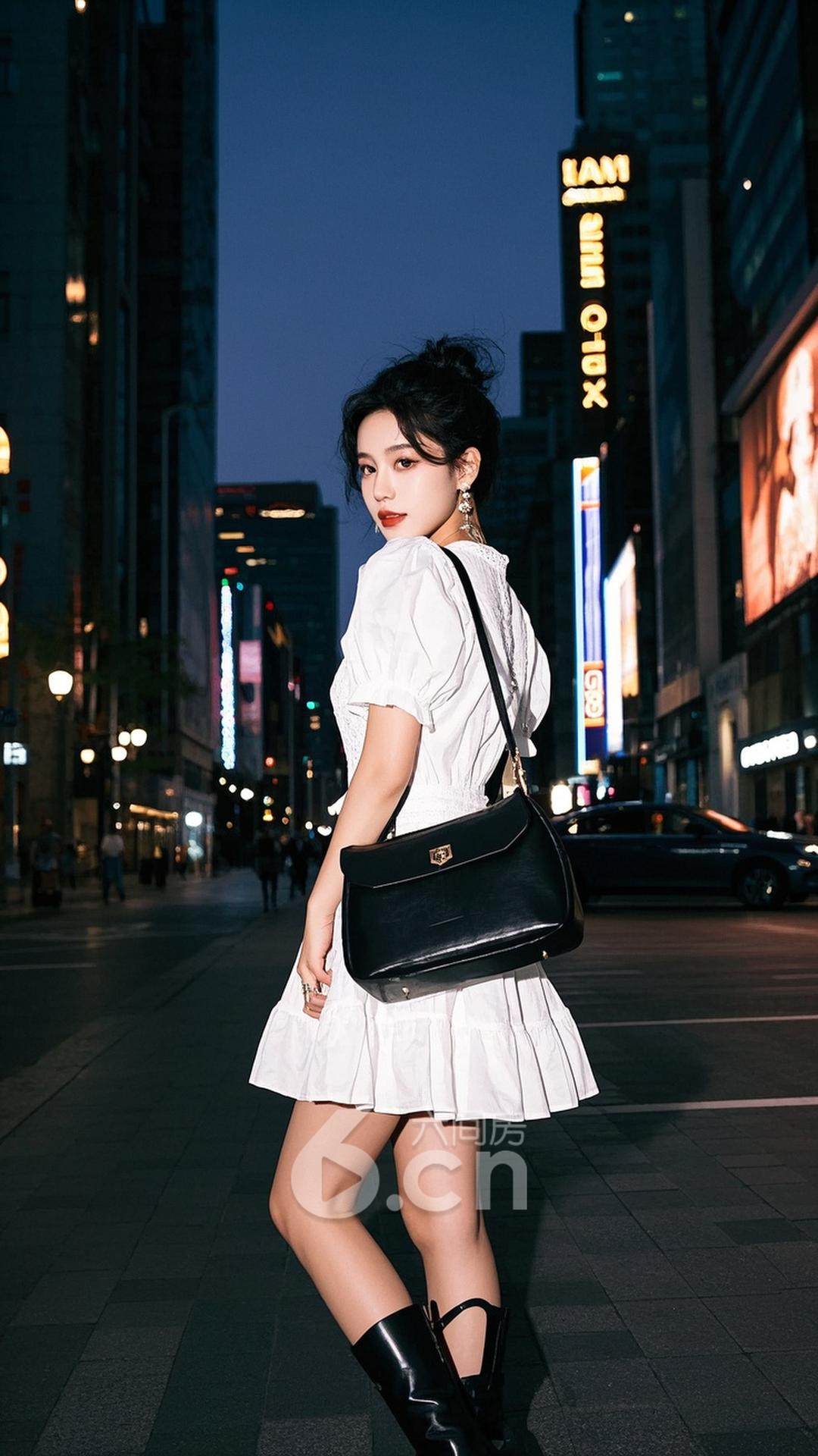 壁纸小能手下载无水印版一位年轻的中国女性,穿着一袭流行的复古风格连衣裙,搭配经典的黑色皮包与高跟鞋,站在夜晚的城市街头,背景是充满现代感的高楼与五光十色的霓虹灯,展现她的时尚与优雅壁纸小能手共有0条评论