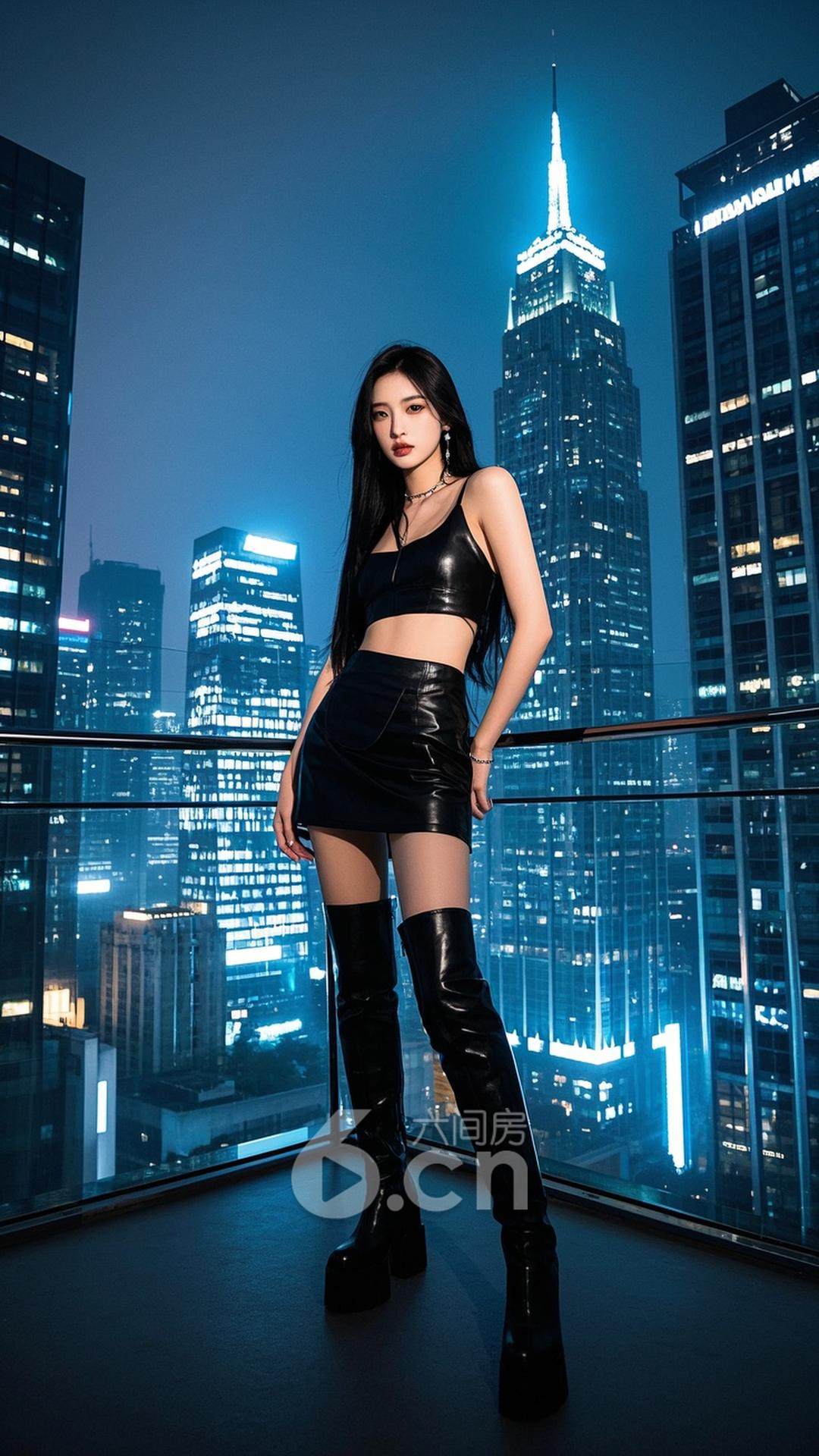 一位年轻的中国女性,穿着皮质短裙,搭配大胆的黑色高跟靴,长发披肩,站在城市天际线的高楼平台上,背景是现代城市的霓虹灯与建筑,展现她的独立与前卫魅力