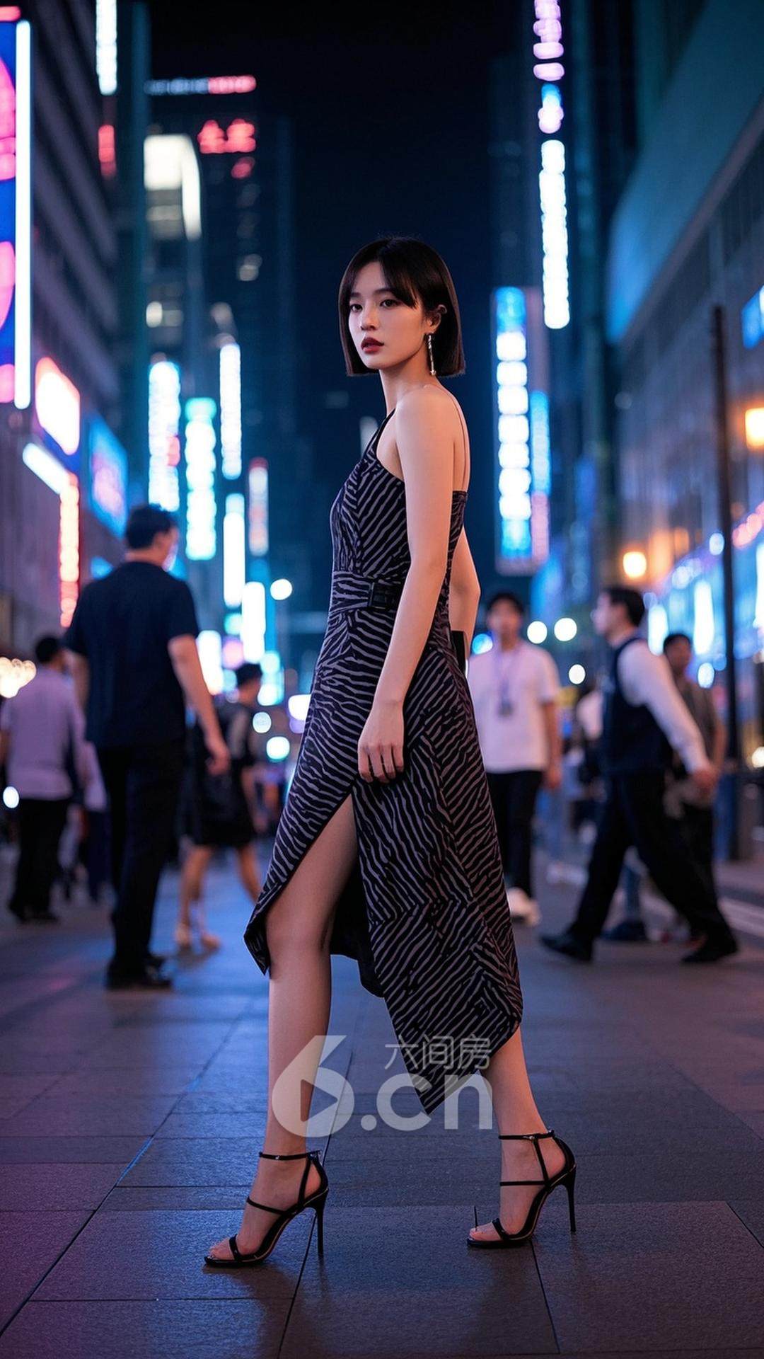 一位年轻的中国女性,穿着不对称设计的条纹连衣裙,搭配时尚的高跟鞋,短发,站在霓虹灯璀璨的街角,背景是忙碌的城市街道与充满活力的夜生活,展现她的个性与自信