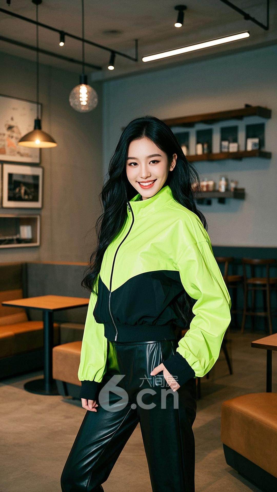 一位年轻的中国女性,穿着黑色皮裤,搭配亮眼的荧光色运动夹克,长发高束,站在风格独特的咖啡馆前,背景是创意十足的现代家具与精致的装饰,展现她的个性与时尚感