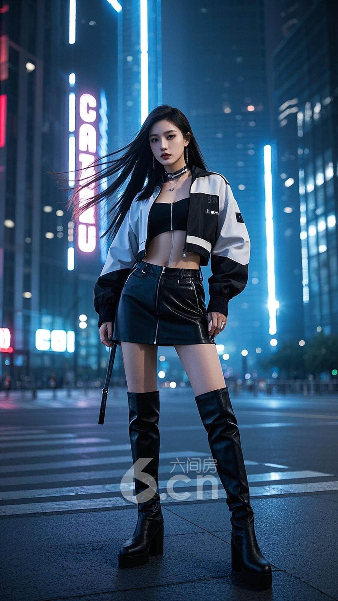 一位女性,穿着拼接设计的运动外套与黑色皮裙,搭配时尚的高筒靴,长发随风飘动,站在现代化的街头,背景是未来感十足的建筑与都市霓虹灯,展现她的前卫与自信