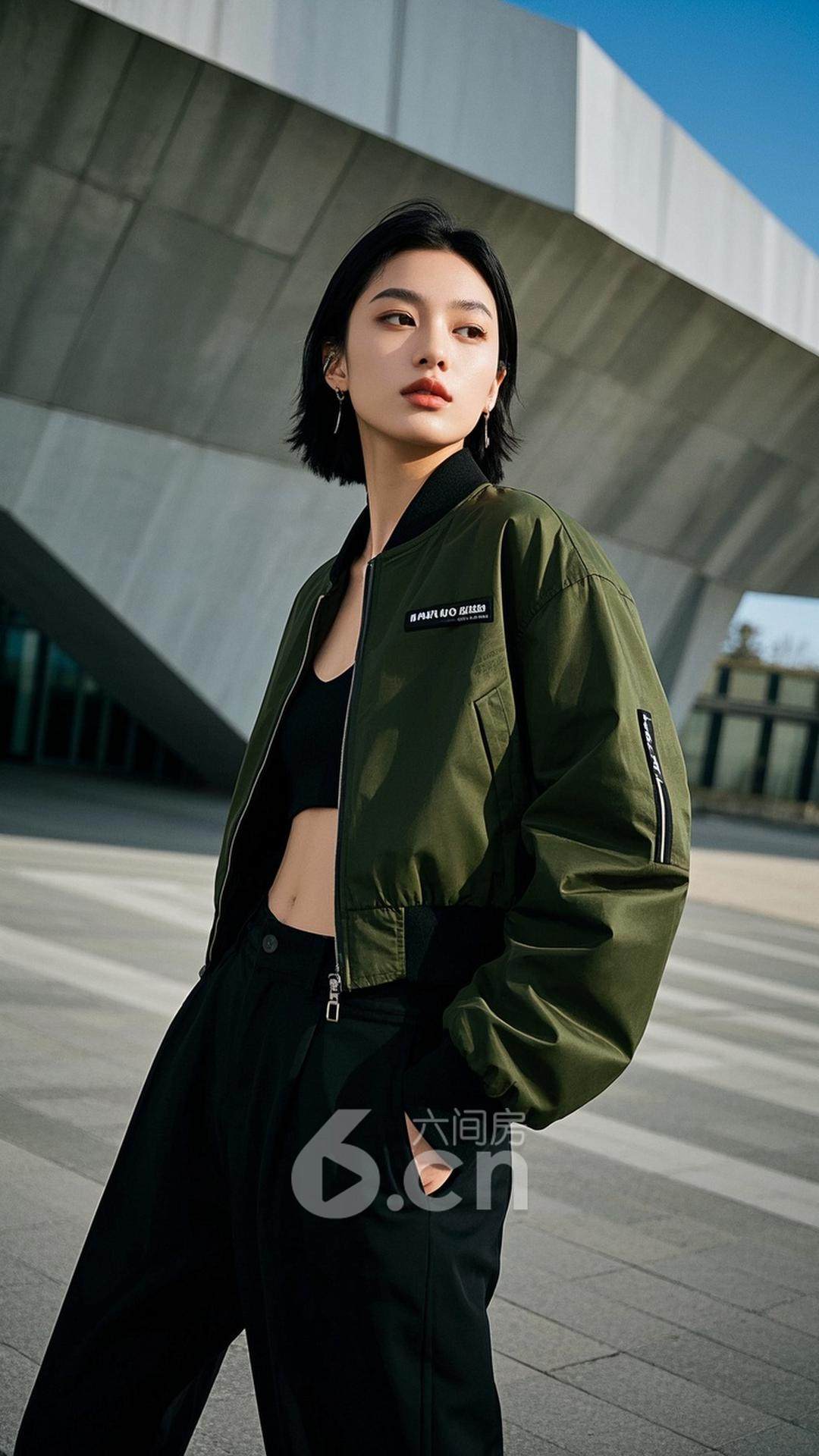壁纸小能手下载无水印版一位年轻的中国女性,穿着炫酷的军绿色夹克,搭配高腰黑色裤子和时尚的运动鞋,短发,站在现代艺术博物馆前,背景是建筑的独特设计与极简风格的场景,展现她的时尚与前卫气质壁纸小能手共有0条评论