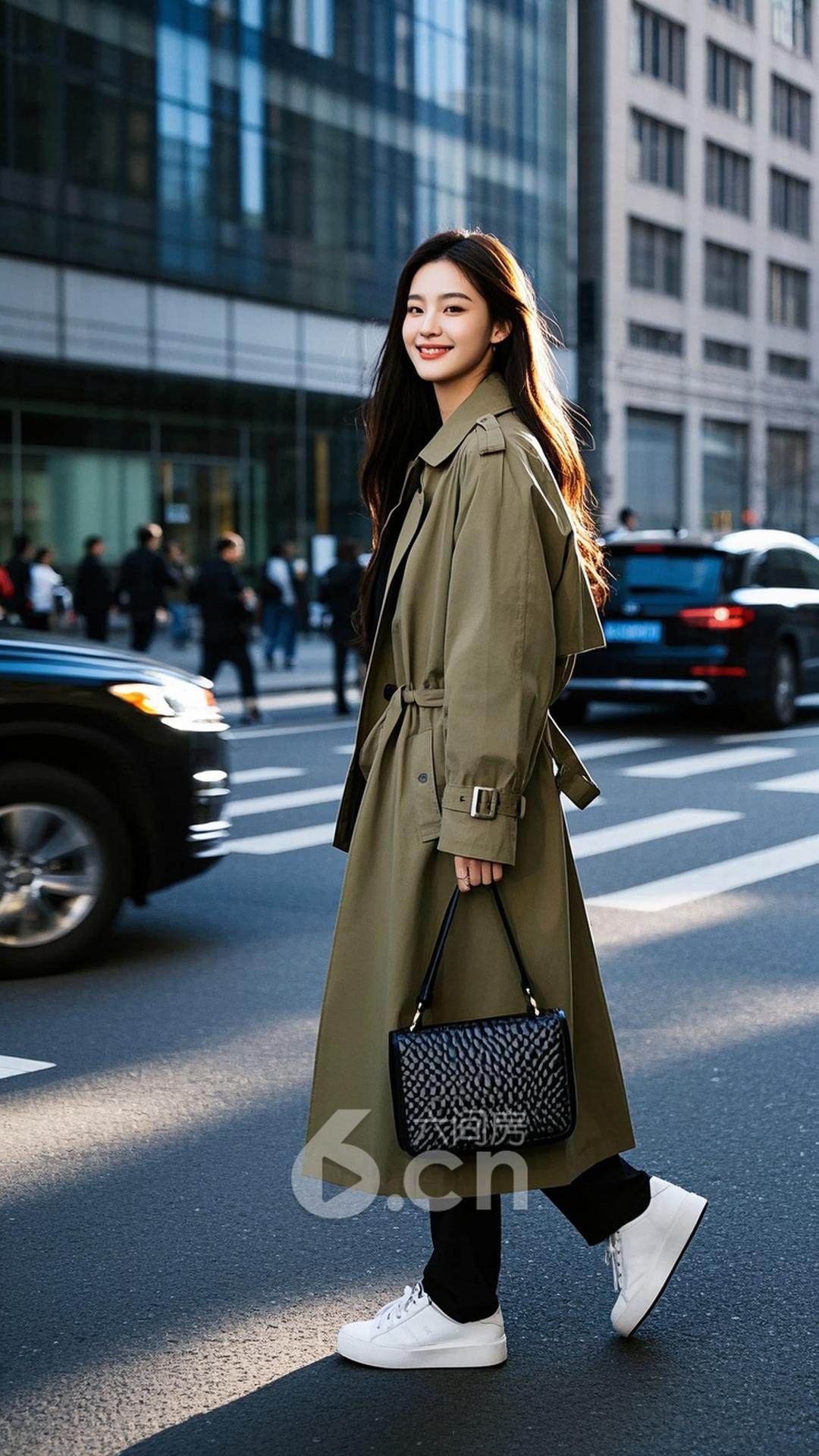 一位年轻的中国女性,穿着复古风的风衣,搭配白色运动鞋与个性十足的手袋,长发披肩,站在城市的现代建筑前,背景是快速行驶的汽车与繁忙的街道,展现她的个性与时尚感