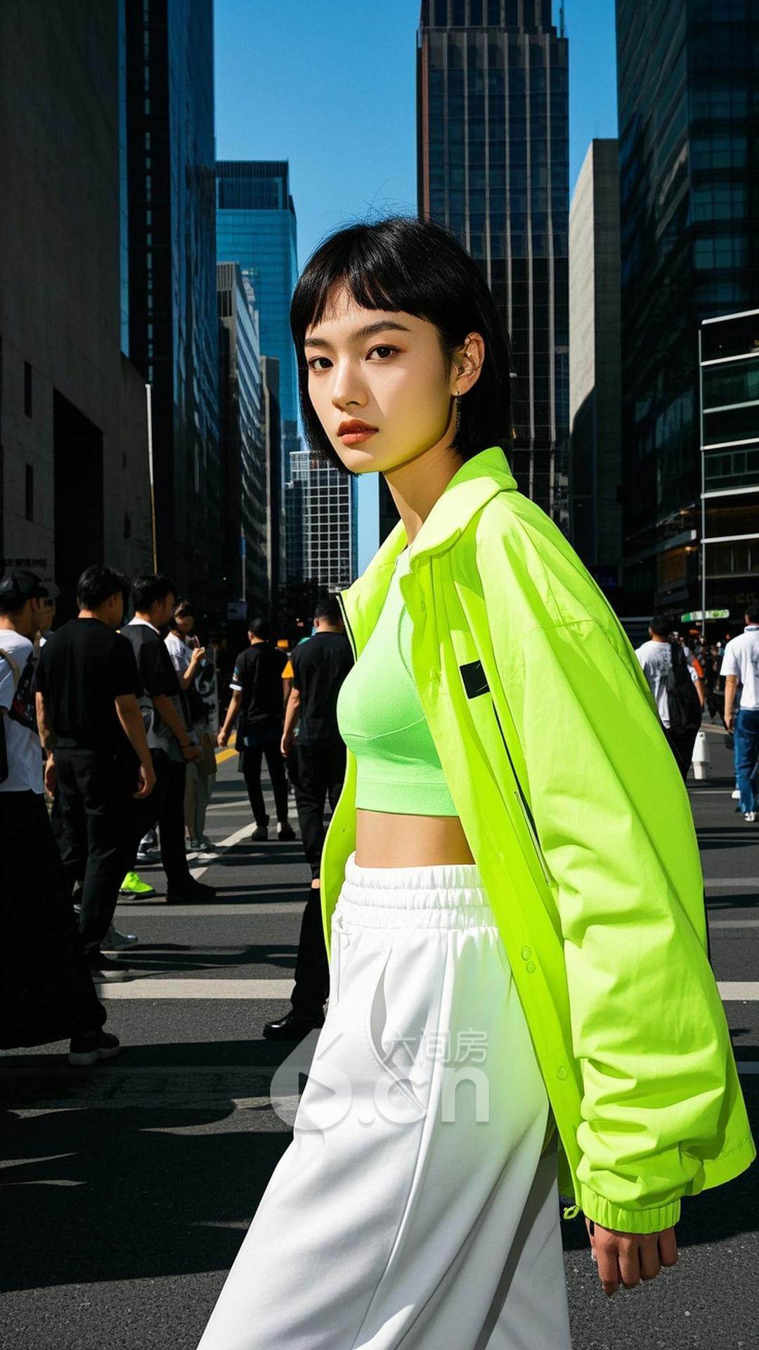 一位年轻的中国女性,穿着荧光色的外套,搭配白色运动裤,短发,站在热闹的都市街头,背景是熙熙攘攘的人群和现代化的建筑,展现她的活力与前卫时尚感