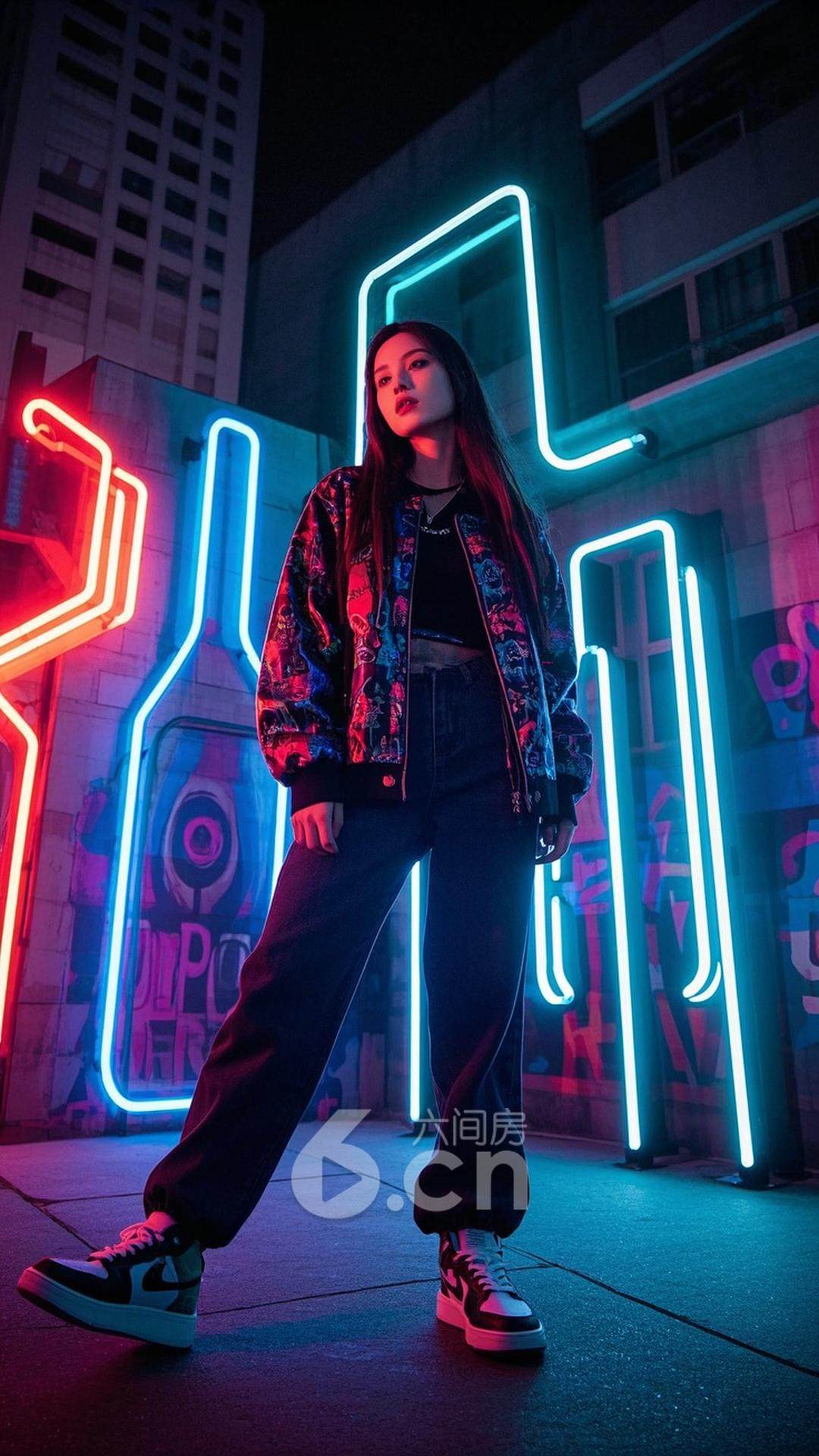 一位女性,穿着图案独特的夹克,搭配休闲牛仔裤与运动鞋,长发披肩,站在充满创意的街头,背景是现代街头艺术和五光十色的霓虹灯,展现她的个性与独特风格