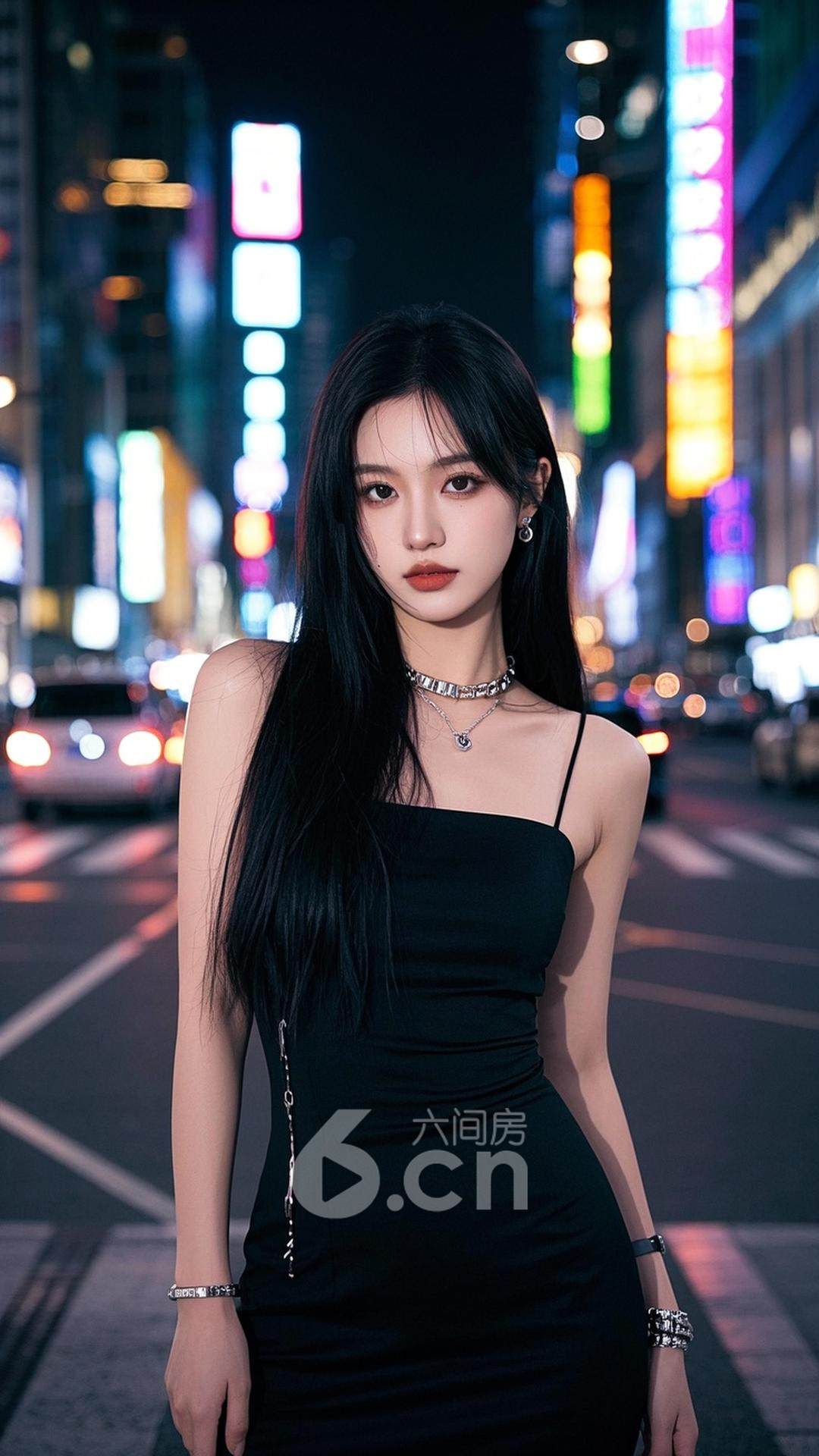 一位年轻的中国女性,穿着紧身黑色连衣裙,搭配时尚的金属配饰,长发自然披肩,站在夜晚的都市街头,背景是闪烁的霓虹灯与繁忙的城市街景,展现她的优雅与前卫魅力