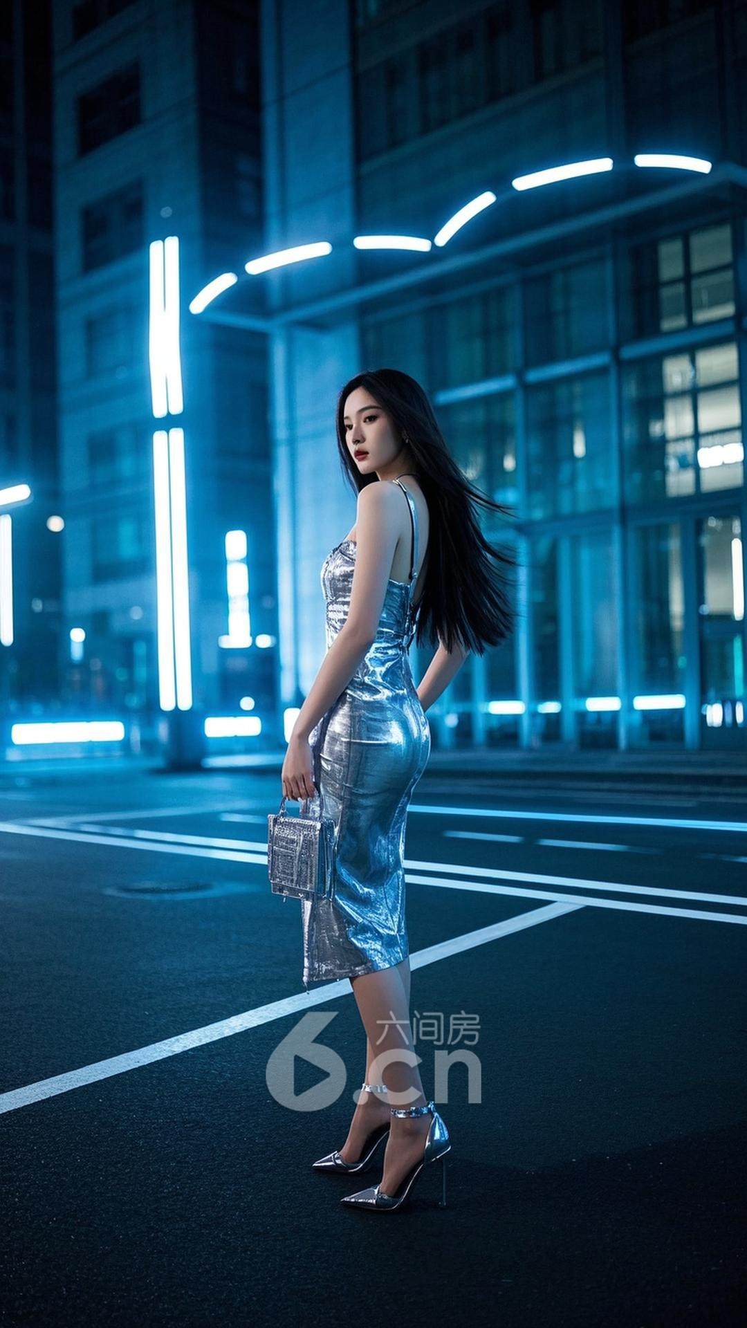一位女性,穿着前卫的银色连衣裙,搭配现代感十足的高跟鞋,长发随风飘动,站在未来感十足的建筑前,背景是科技感十足的灯光与动态的街景,展现她的自信与独特魅力