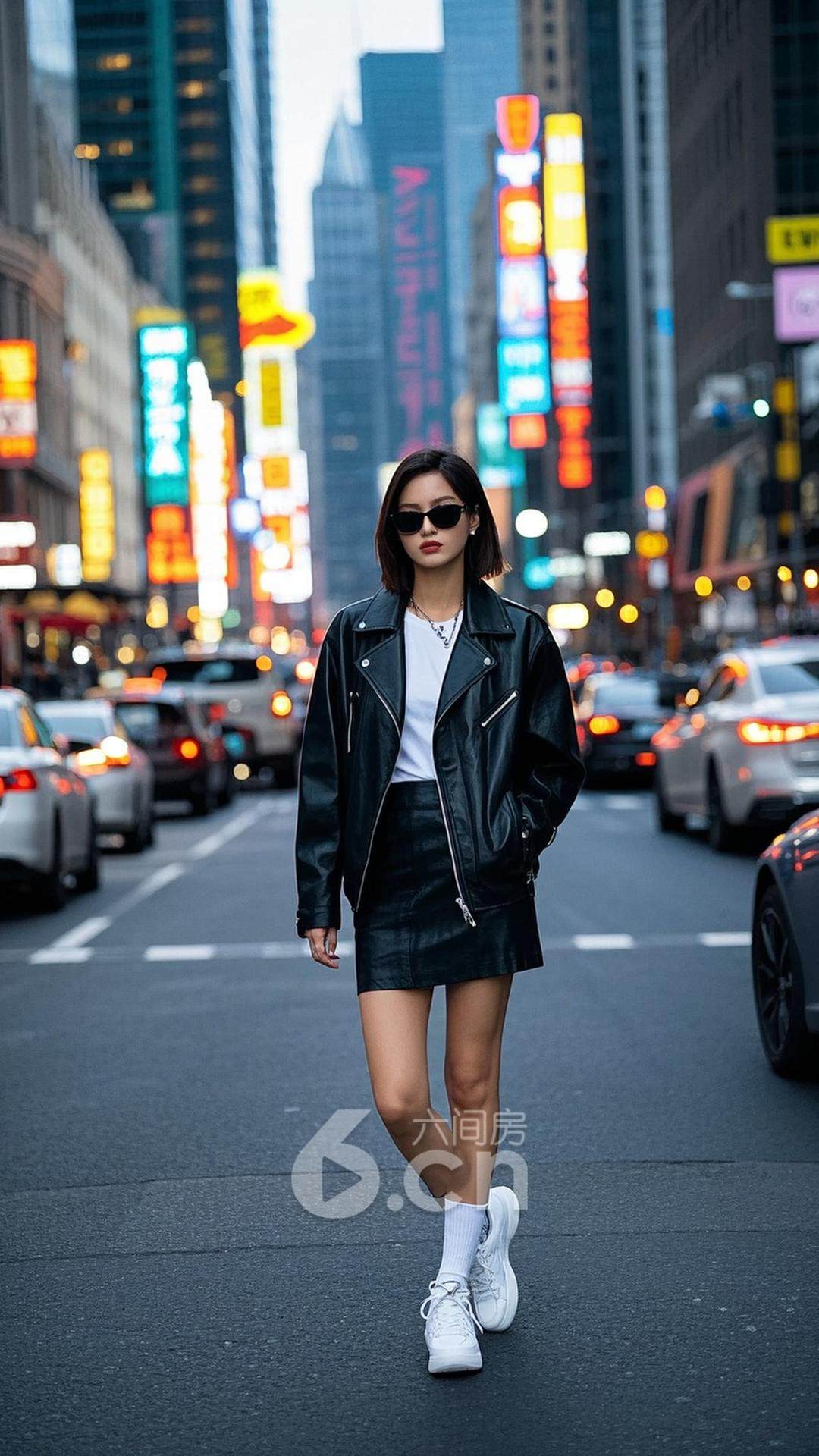 一位年轻的中国女性,穿着黑色皮夹克,搭配短裙与白色运动鞋,短发,站在都市的繁忙街头,背景是流动的汽车与五光十色的广告牌,展现她的个性与前卫感