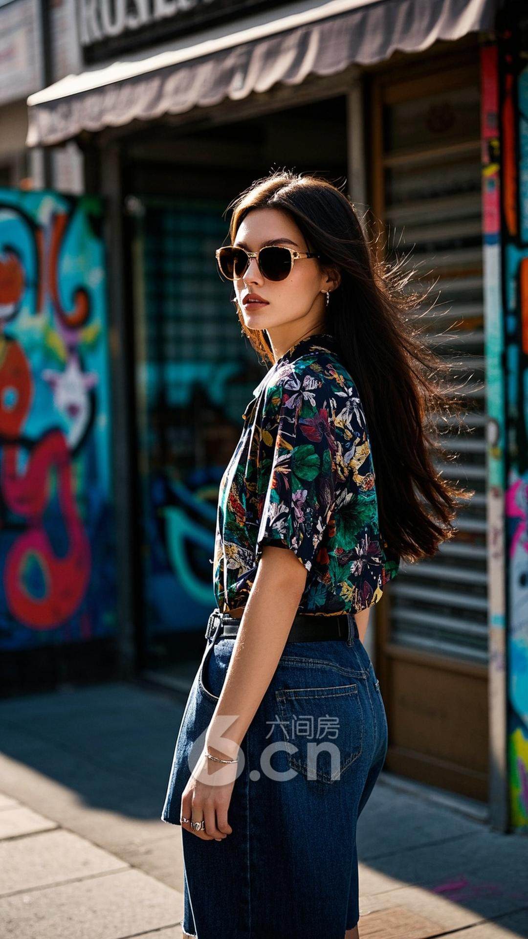 一位女性,穿着印花衬衫与宽松短裤,搭配个性十足的太阳镜,长发随风飘动,站在充满艺术氛围的街头,背景是色彩斑斓的涂鸦与时尚的小店,展现她的青春与时尚感