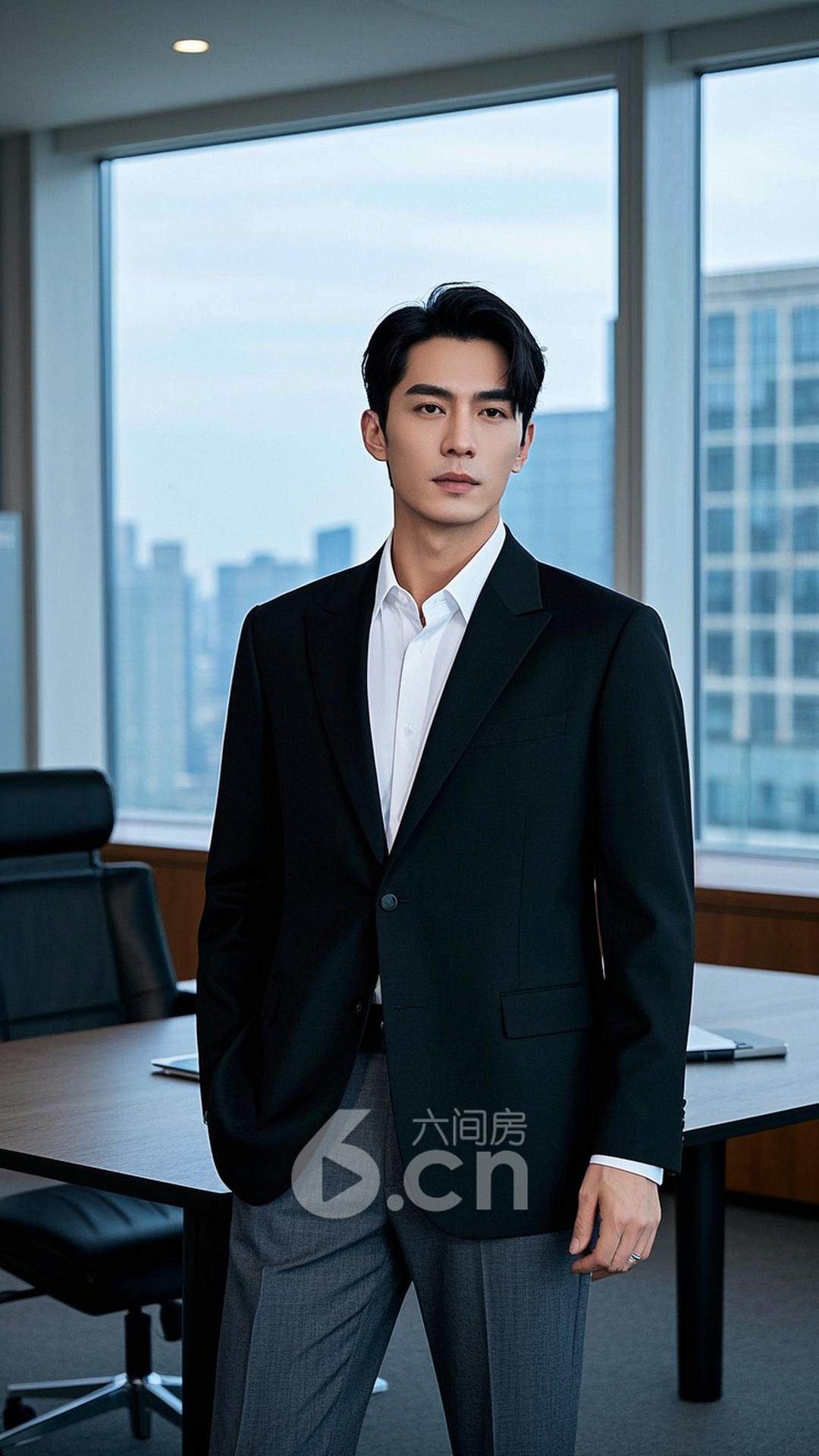一位男性,穿着黑色休闲西装外套与灰色裤子,搭配白色衬衫,站在高档办公室内,背景是现代办公家具与玻璃窗外的城市天际线,展现他精致且前卫的工作风格