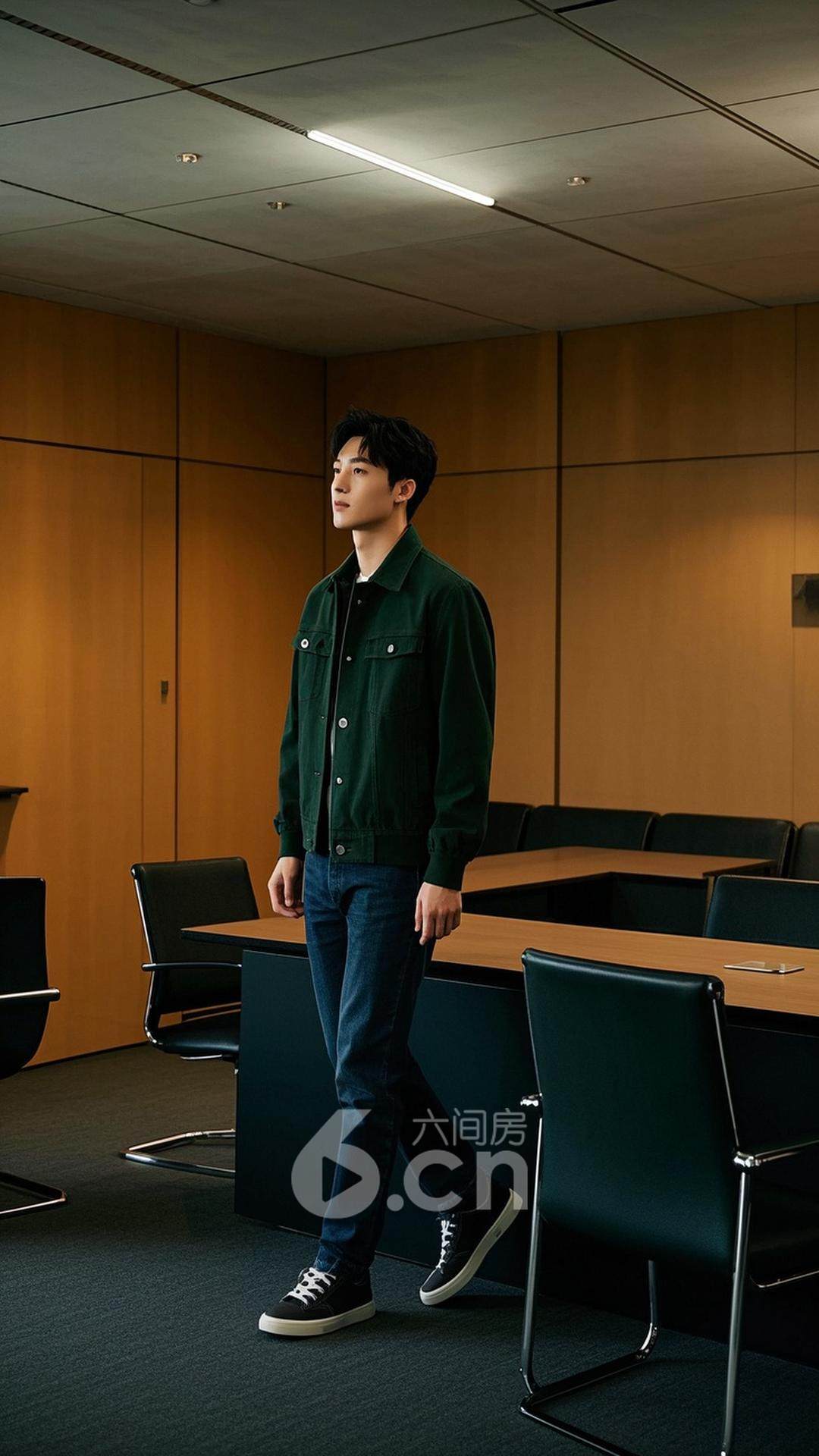 一位年轻的中国男性,穿着简单的深绿色外套与牛仔裤,搭配休闲鞋,站在现代化办公室的会议桌旁,背景是简约风格的办公家具与温暖的灯光,展现他舒适而时尚的工作着装