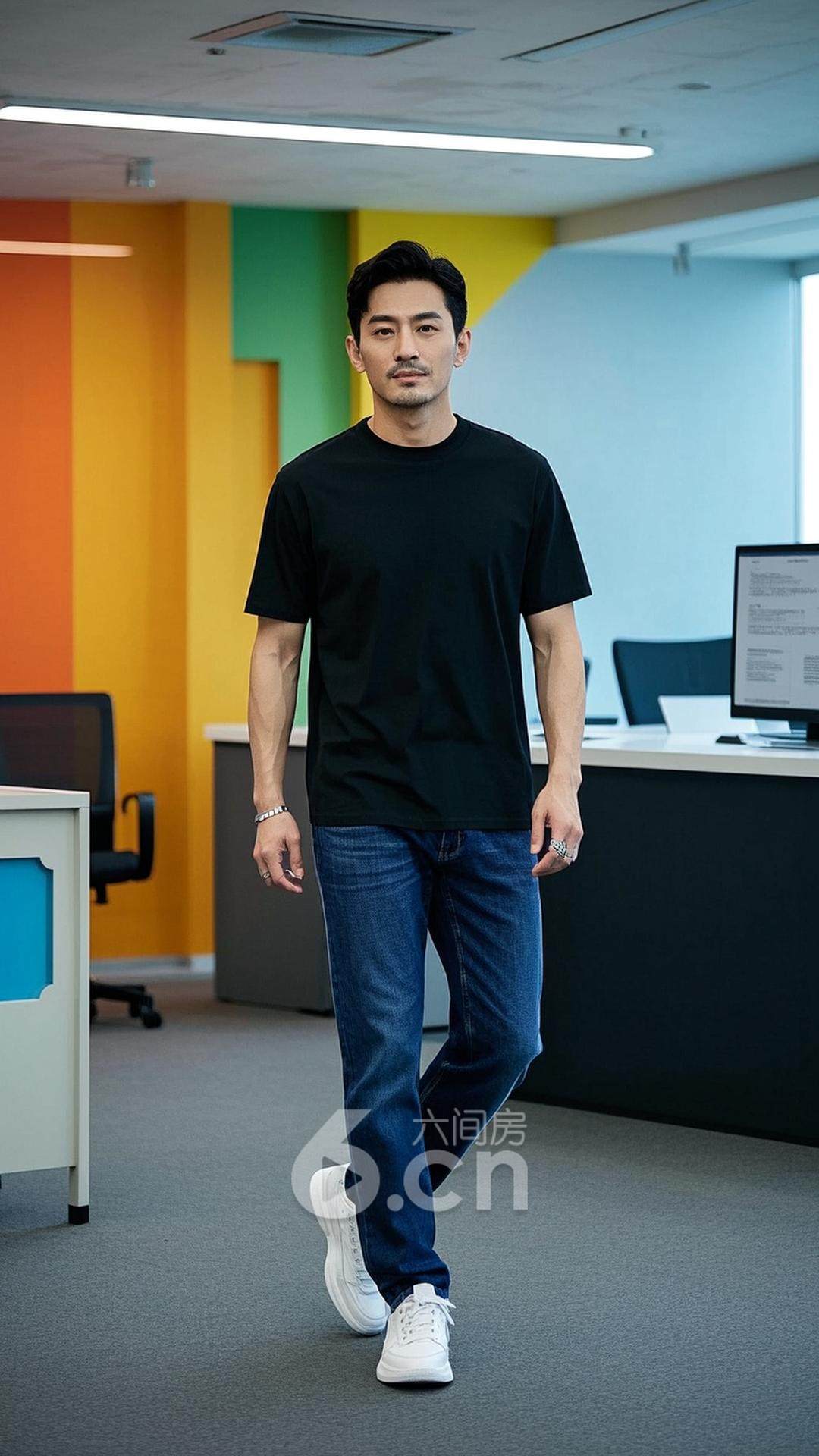 一位男性,穿着经典黑色T恤与蓝色牛仔裤,搭配白色运动鞋,站在充满创意装饰的办公室内,背景是五光十色的墙壁与现代化的办公设备,展现他自由而现代的工作气质