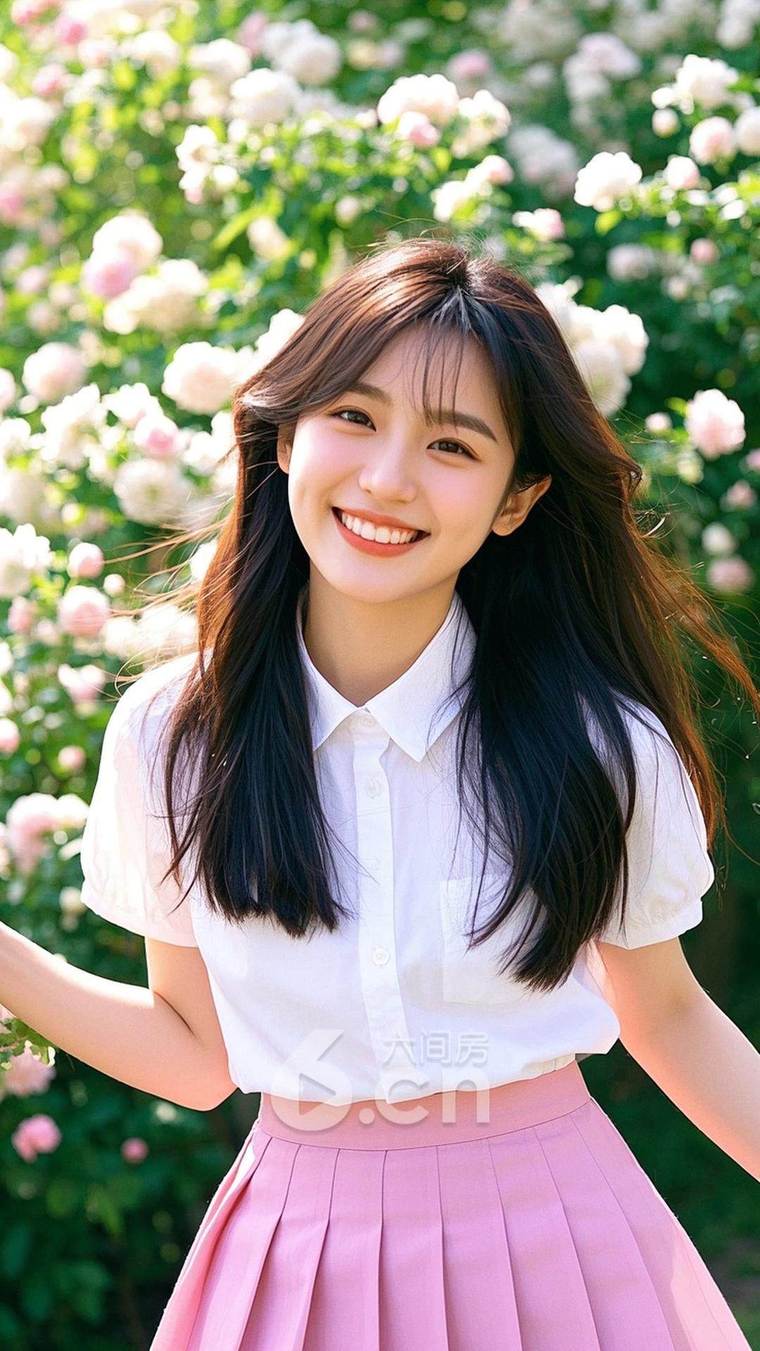 一位年轻的中国女性,穿着粉色短裙与白色衬衫,长发随风飘动,站在阳光下的花丛中,背景是盛开的花朵与清新的春风,展现她的清新与温暖
