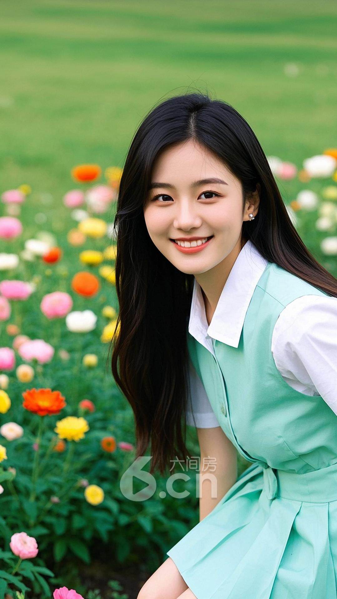 一位年轻的中国女性,穿着薄荷绿短裙与白色衬衫,长发披肩,站在开满花的春天花园中,背景是色彩斑斓的花朵与青翠的草地,展现她的温柔与浪漫气息