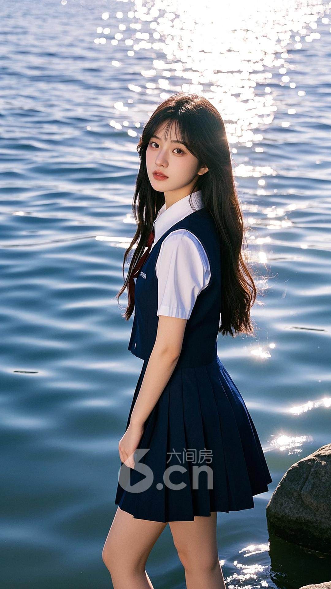 一位年轻的中国女性,穿着深蓝色短裙与白色衬衫,长发自然披散,站在春天的湖边,背景是湖面泛起的涟漪与阳光,展现她的优雅与清新气息