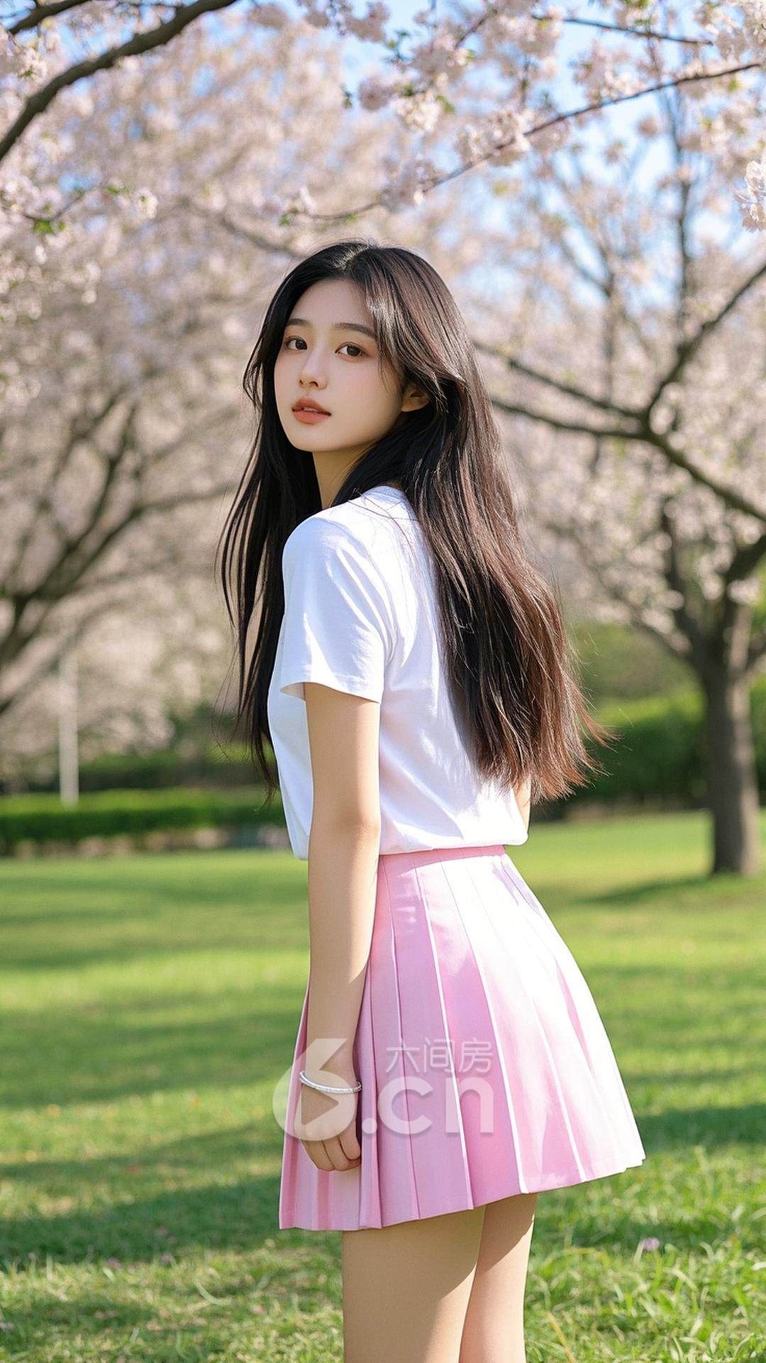 一位年轻的中国女性,穿着浅粉色短裙与白色T恤,长发自然披肩,站在阳光明媚的公园里,背景是盛开的樱花与翠绿的草地,展现她的青春与清新气息