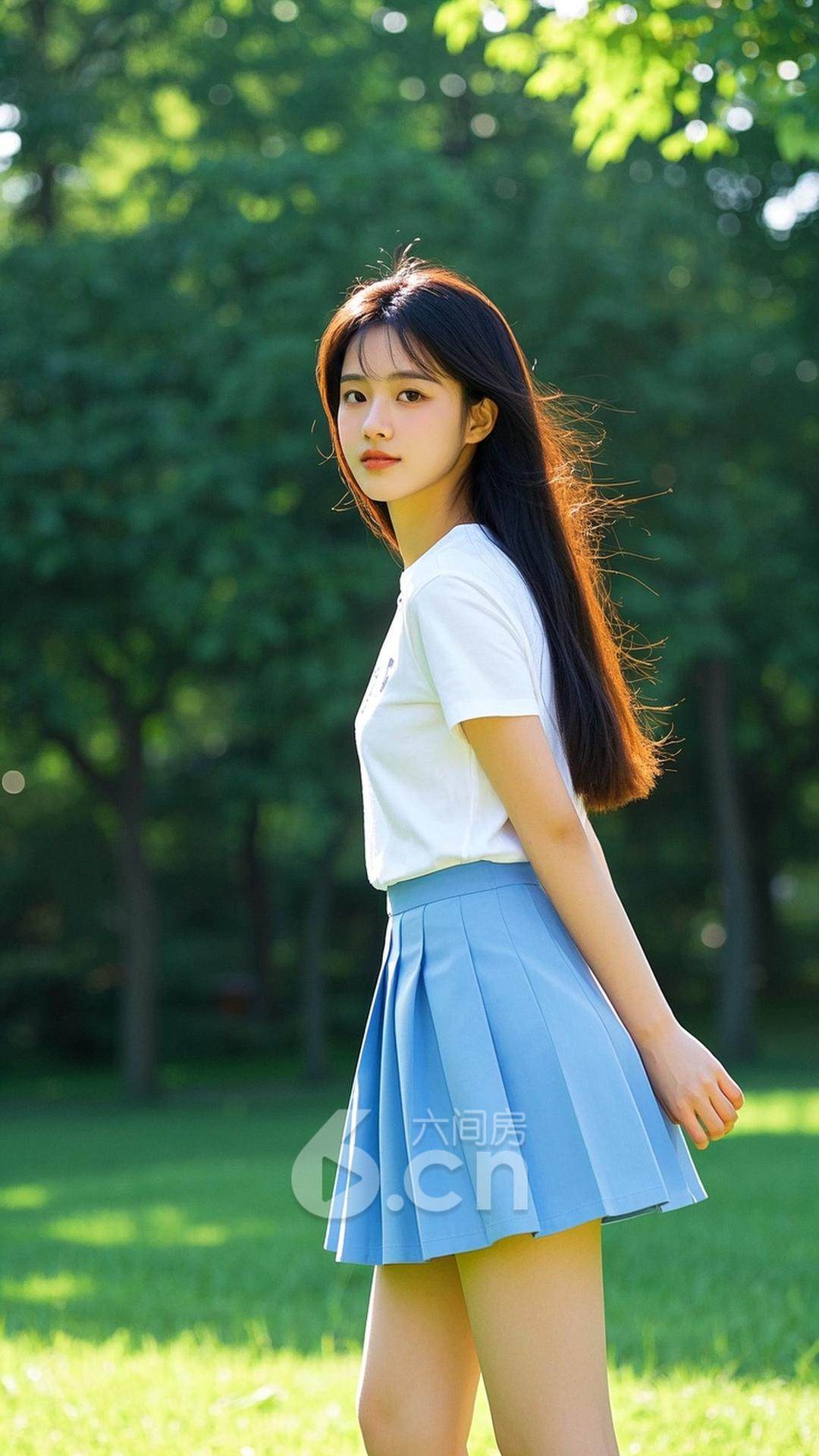 一位年轻的中国女性,穿着淡蓝色短裙与白色T恤,长发自然垂落,站在阳光明媚的草地上,背景是郁郁葱葱的树木与温暖的春风,展现她的清新与自然气息