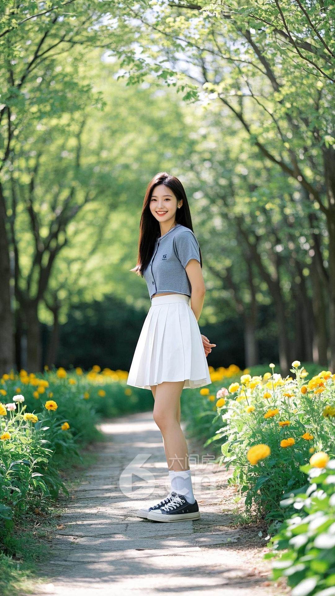 一位年轻的中国女性,穿着简约的白色短裙与灰色上衣,搭配舒适的帆布鞋,站在开满花的公园小道上,背景是春天温暖的阳光与绿树成荫的景象,展现她的清新与自信