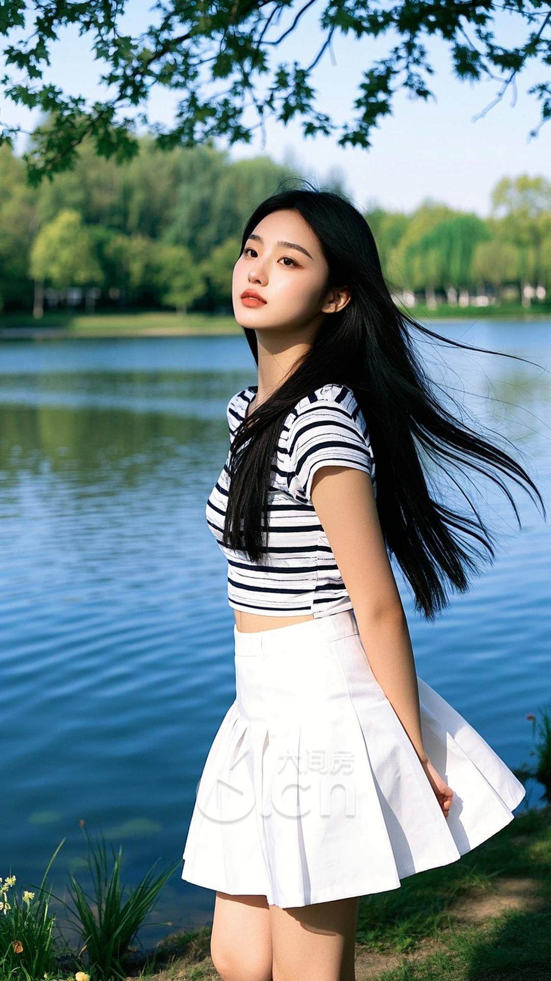 一位年轻的中国女性,穿着白色短裙与条纹上衣,长发飘逸,站在春天的湖边,背景是湖水倒映的蓝天与阳光,展现她的优雅与自由气息