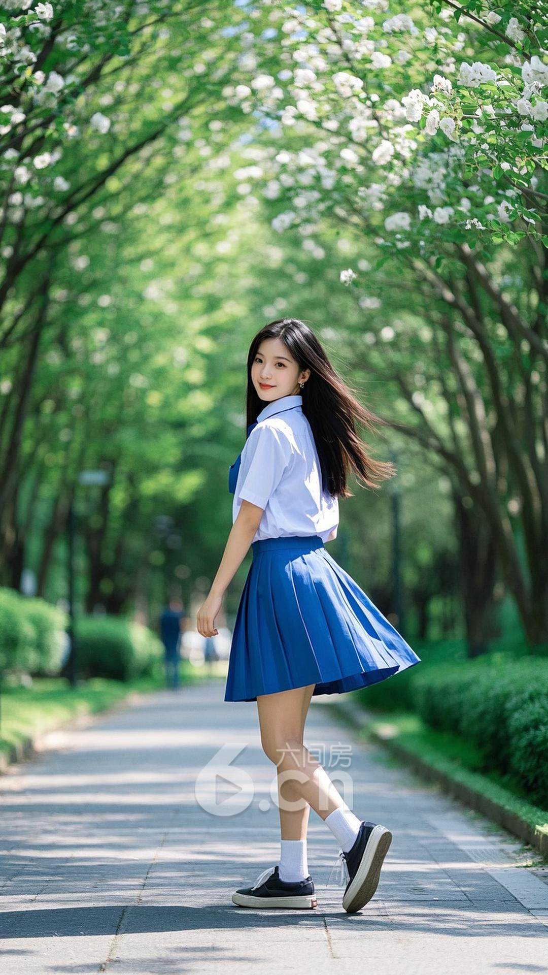 一位年轻的中国女性,穿着蓝色短裙与白色衬衫,搭配休闲鞋,长发随风飘动,站在春天的公园小道上,背景是绿树与盛开的花朵,展现她的活力与青春感