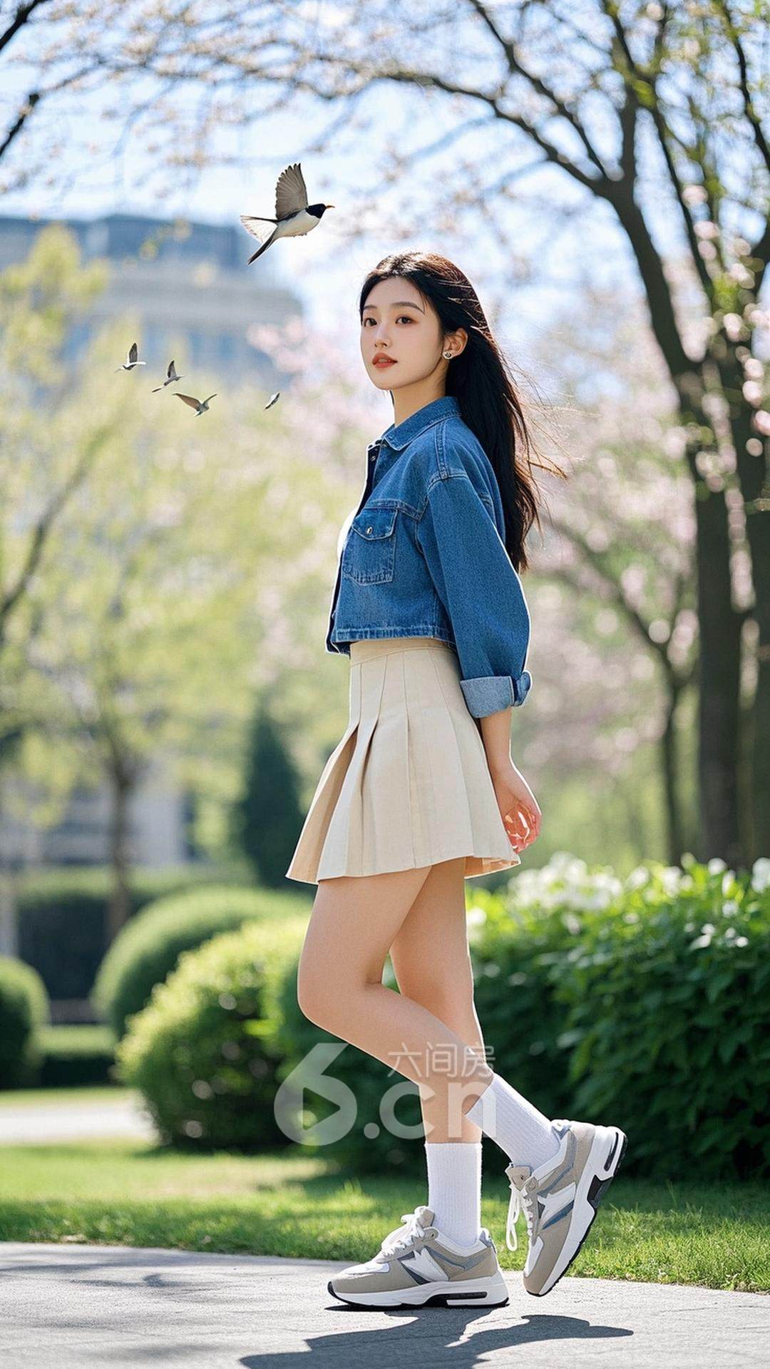 一位年轻的中国女性,穿着米色短裙与蓝色牛仔衬衫,搭配时尚的运动鞋,站在春天的城市公园中,背景是鸟语花香的春日景象,展现她的清新与自然气息