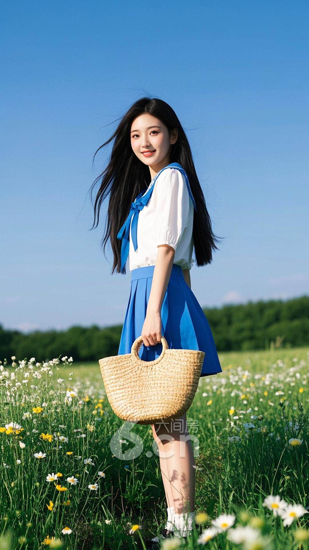 一位年轻的中国女性,穿着蓝色短裙与白色雪纺上衣,搭配时尚的草编包,长发披肩,站在春天的田野间,背景是蓝天与开满野花的草地,展现她的清新与自然美感