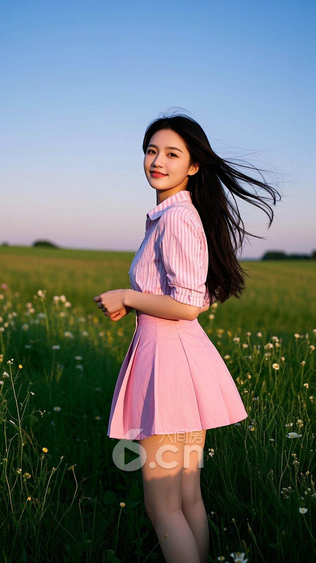 一位年轻的中国女性,穿着粉色短裙与条纹衬衫,长发随风飘动,站在春天的田野中,背景是开满野花的绿草地与蔚蓝的天空,展现她的轻盈与自由