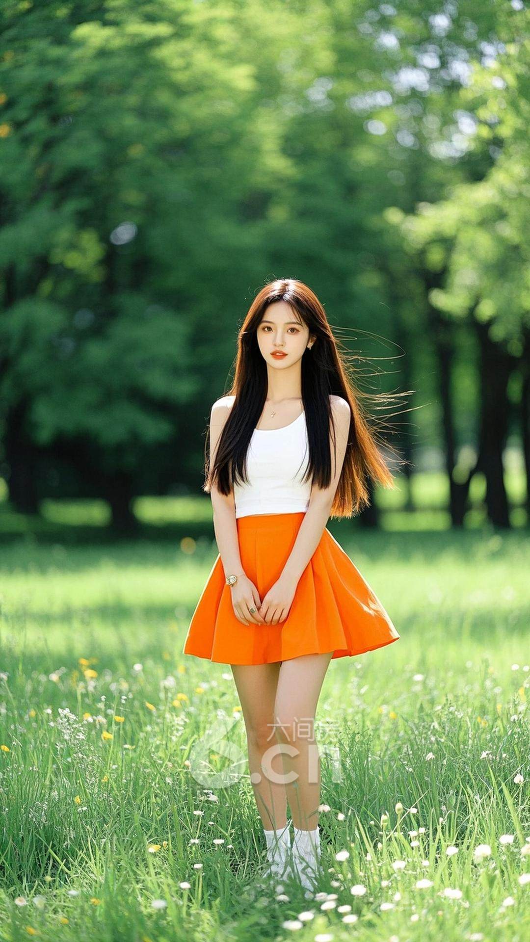 一位年轻的中国女性,穿着橙色短裙与白色上衣,长发披肩,站在春天的草地上,背景是微风拂动的树叶与四周开满的花朵,展现她的自由与活力